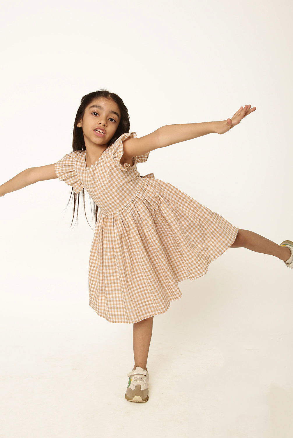 This cotton casual dress is made in gingham flowy fabric with flutter sleeve detail. A smart comfortable outfit for a day outing. This dress features a zip closure at back with a tie up bow detailing. Accessories and doll used by the model are not included with the dress, can be purchased separately