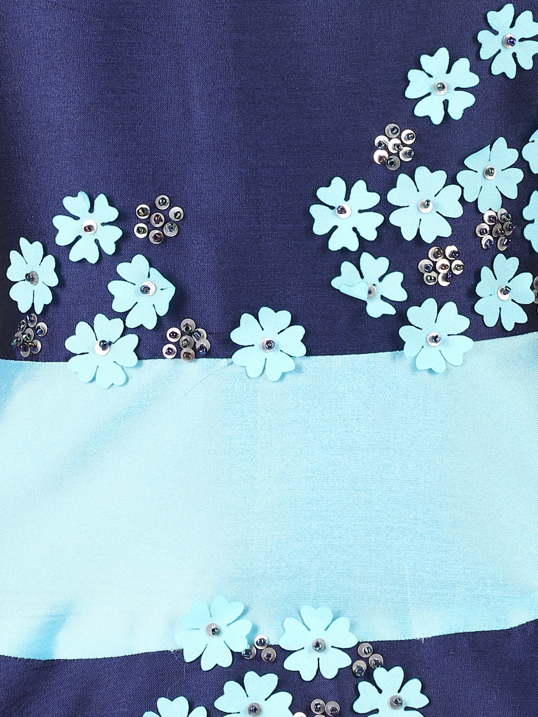 This Blue Hibiscus Dress has gorgeous colors inspired by the Damselfish, little 3D flowers hand embroidered on yoke and tiers makes it stand out. Back zip closure and tie back belt gives it a perfect fit and makes it an easy to wear attire. The dress is made of taffeta and is fully lined by cotton.