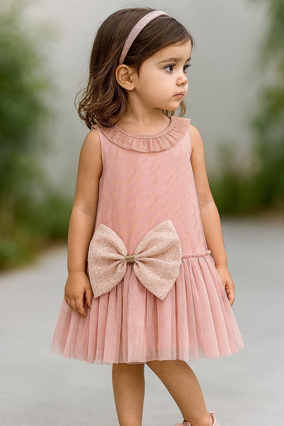 This charming pink dress with soft tulle overlay with a glittery ruffled neckline and a flouncy tutu hem. A standout oversized glitter bow, with gold detail, adds whimsy and elegance. Designed to fall just above the knee, it’s perfect for special occasions with a magical, fairytale flair .