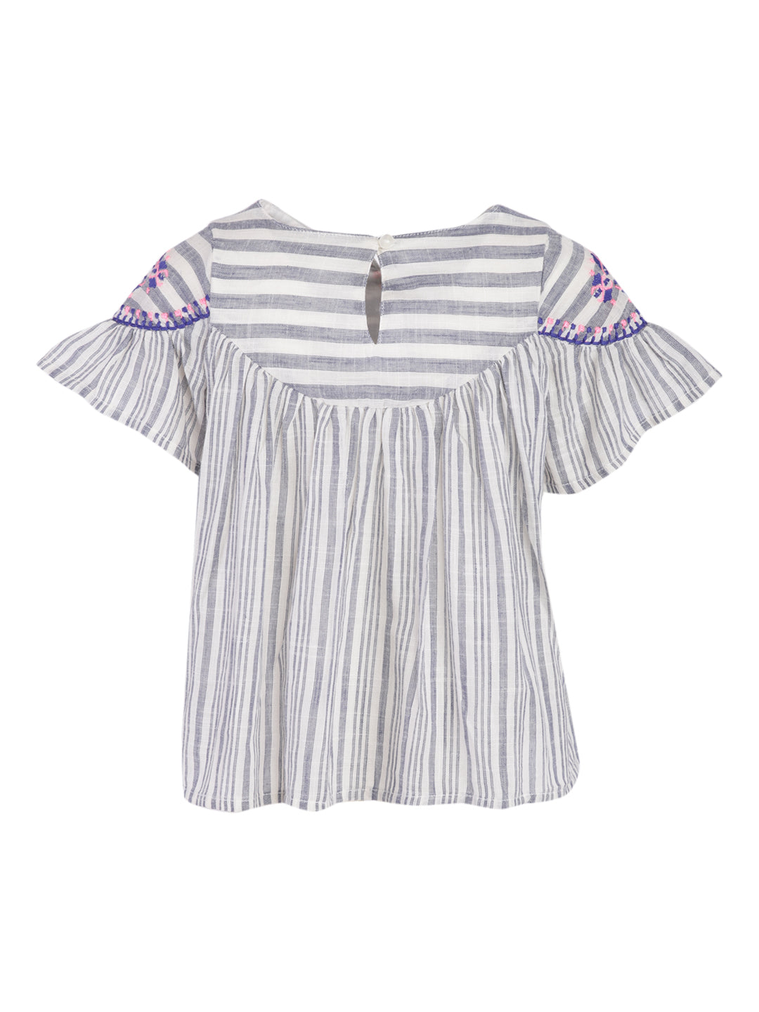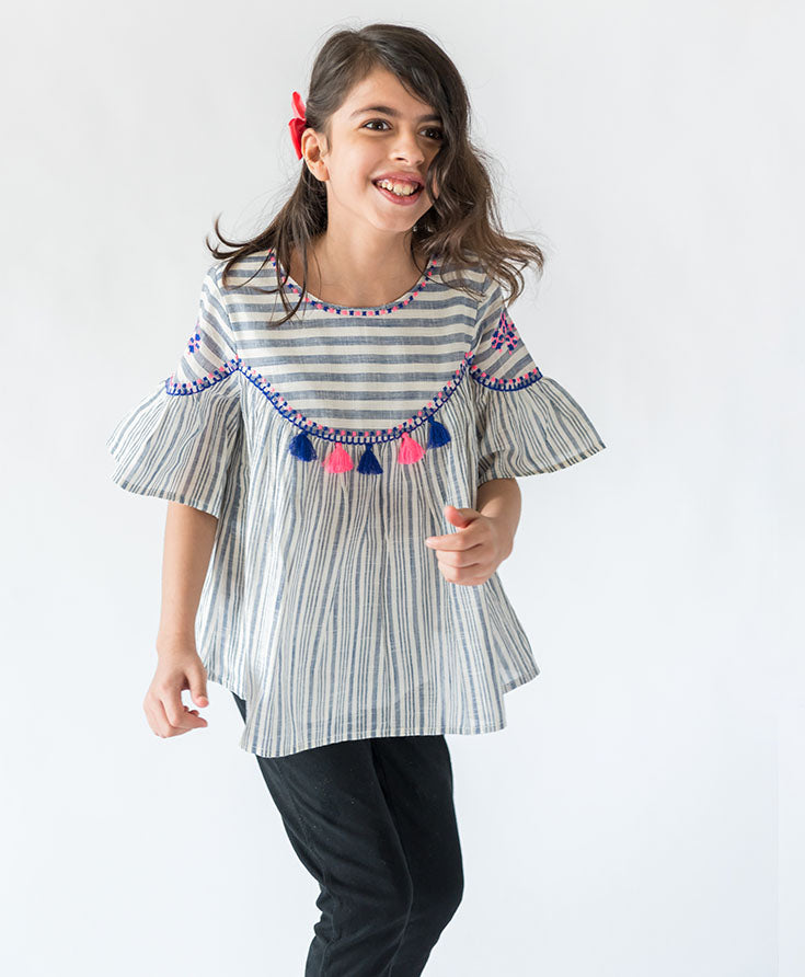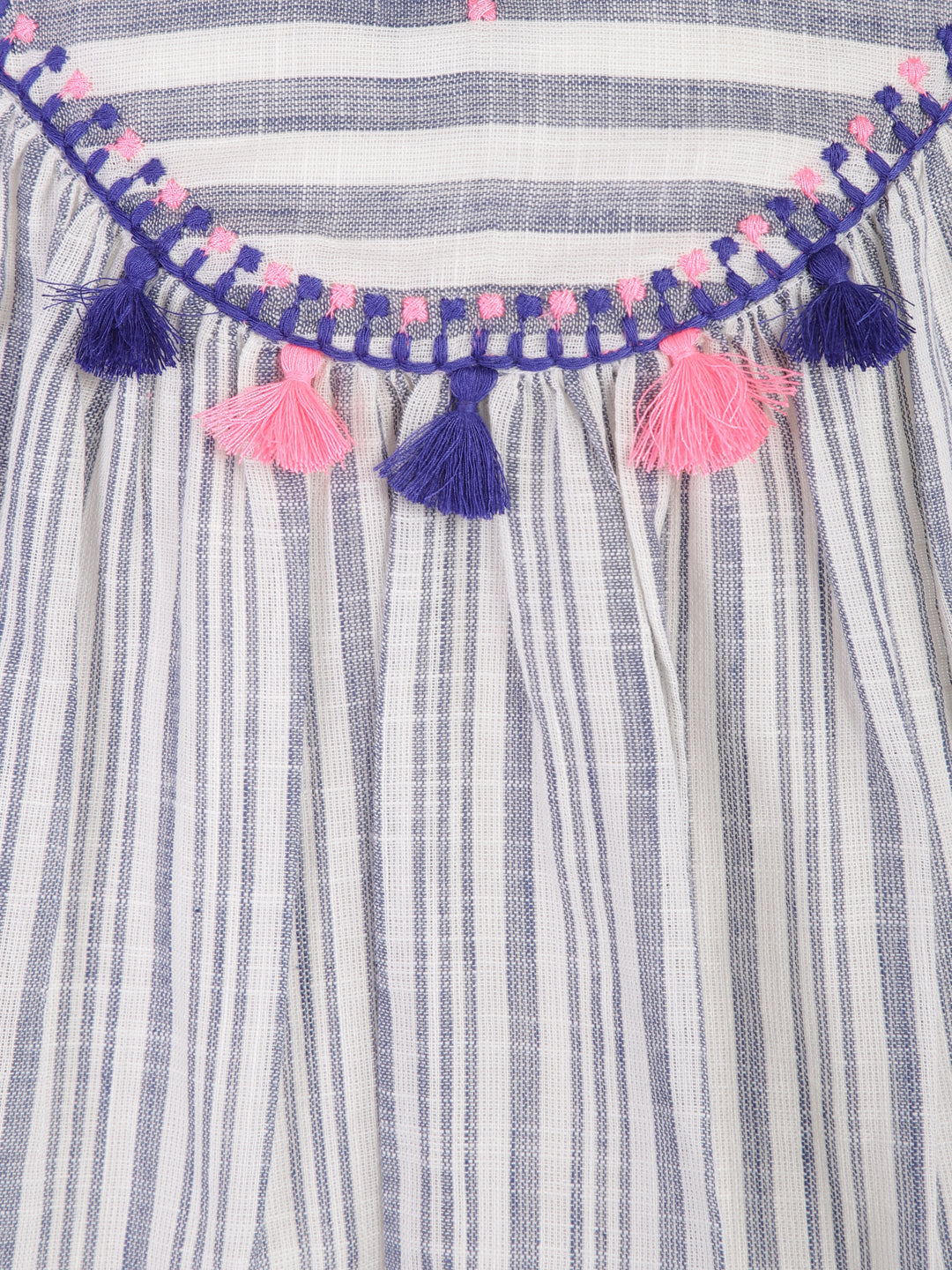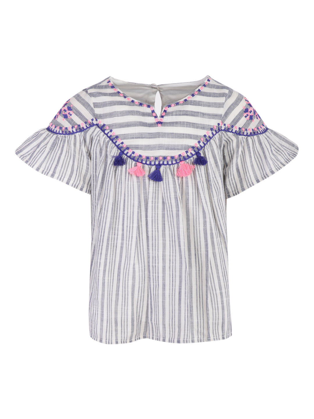 A charming embroidered top with tassles in 100% cotton. Made in soft cotton stripes, and lined with cotton, this top has a button fastening. A stylish comfortable design is good for everyday wear.