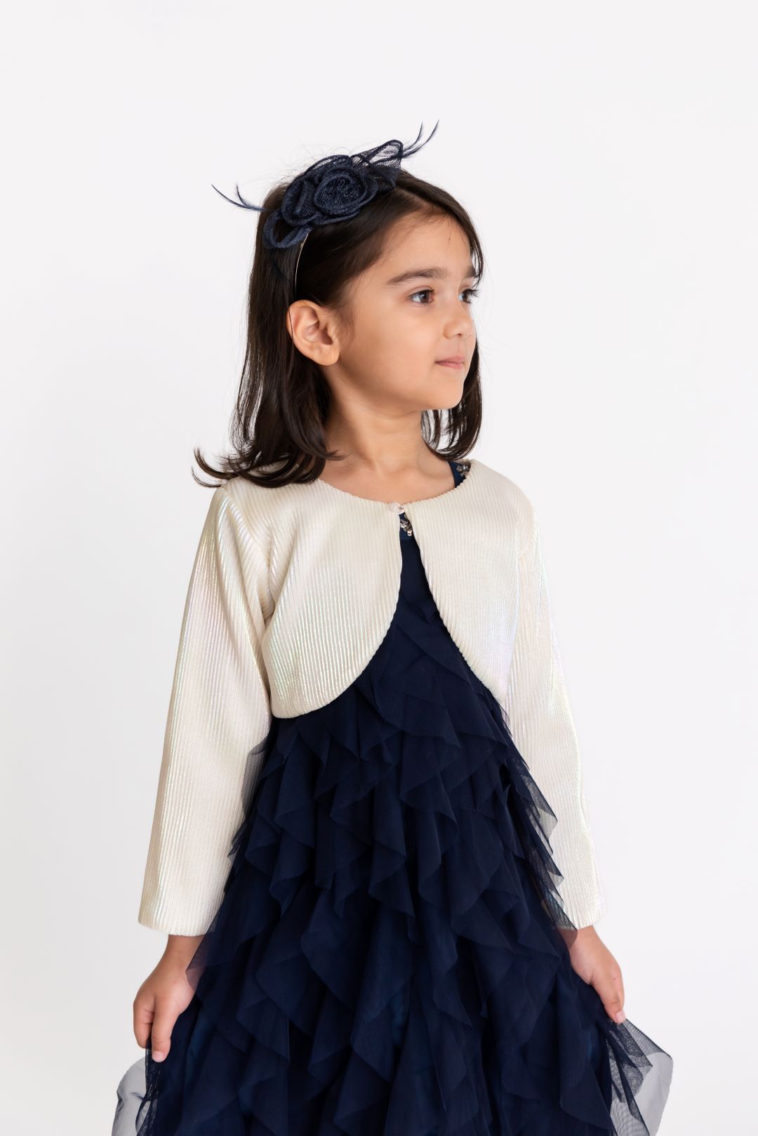 This sophisticated shrug in rainbow off-white fabric is dressy and chic. It goes well with any outfit to keep that nip in the air away. An elegant full sleeved overgarment is just right for a special occasion and it will keep your kid comfortable all day long! It has a circular neck and front button closure for easy access and fuss free dressing. The Dress is not a part of the shrug and can be purchased separately.