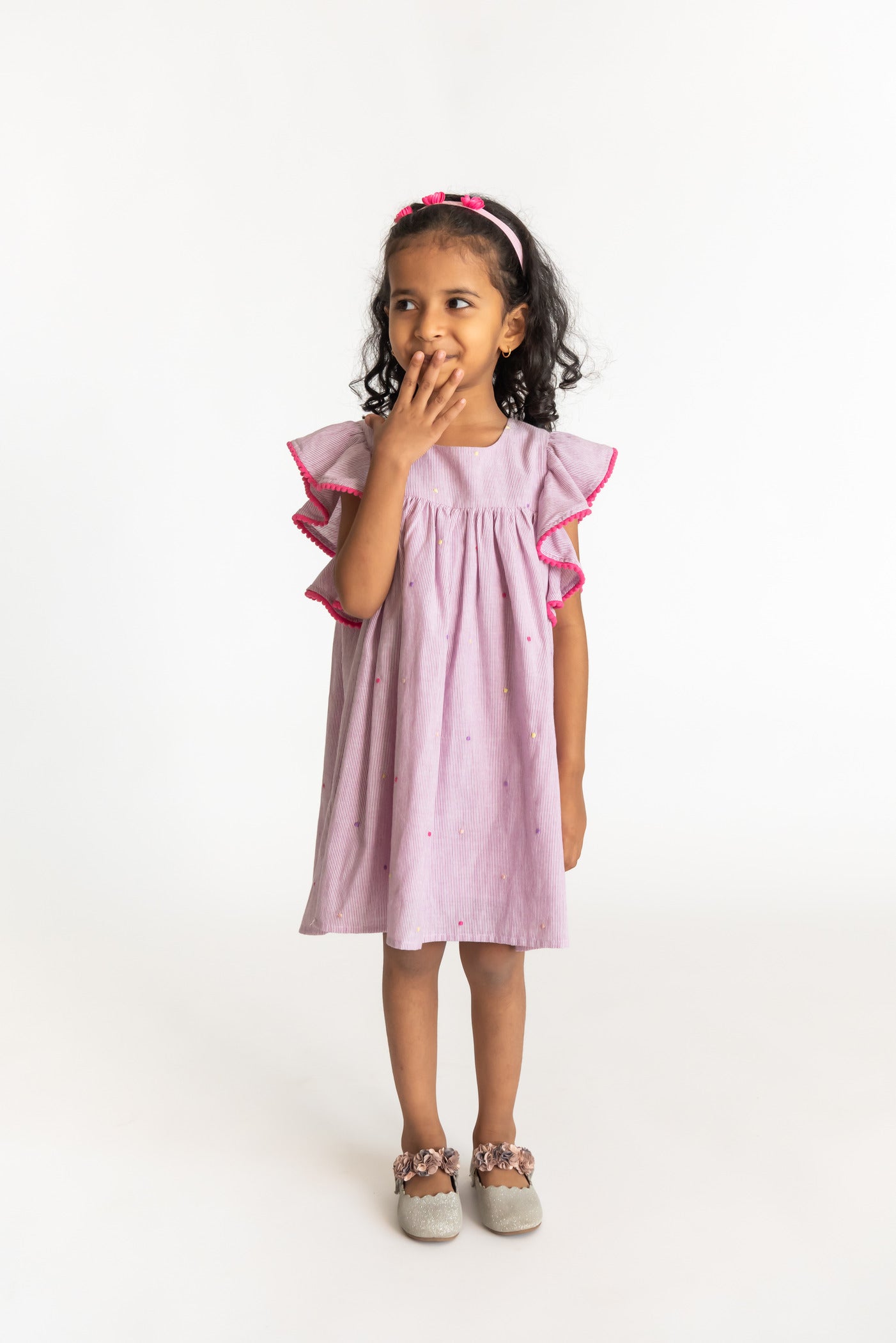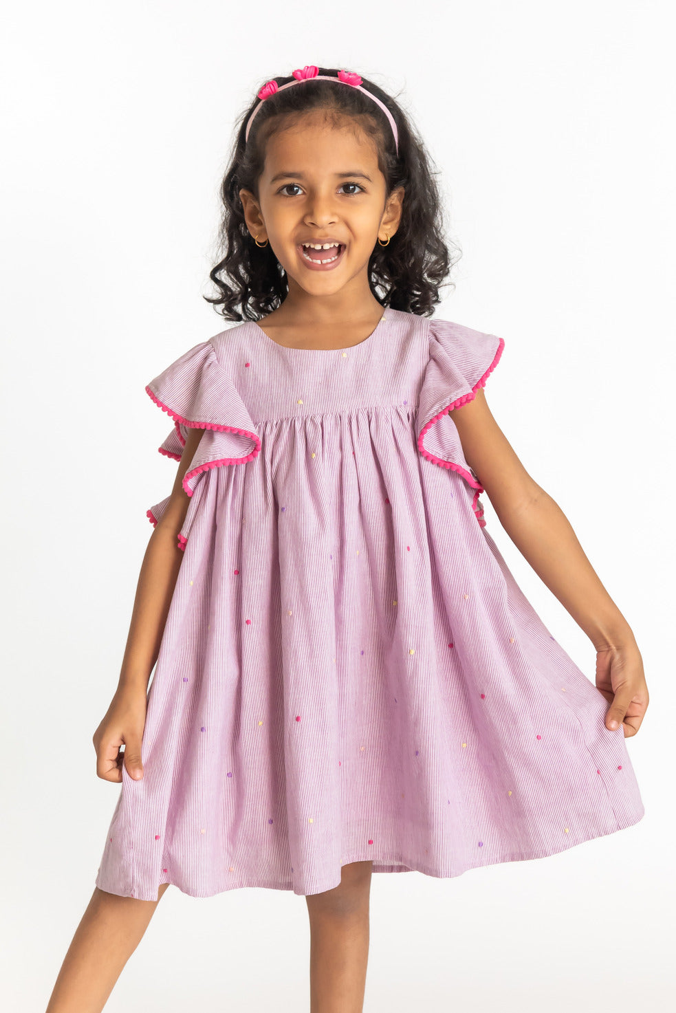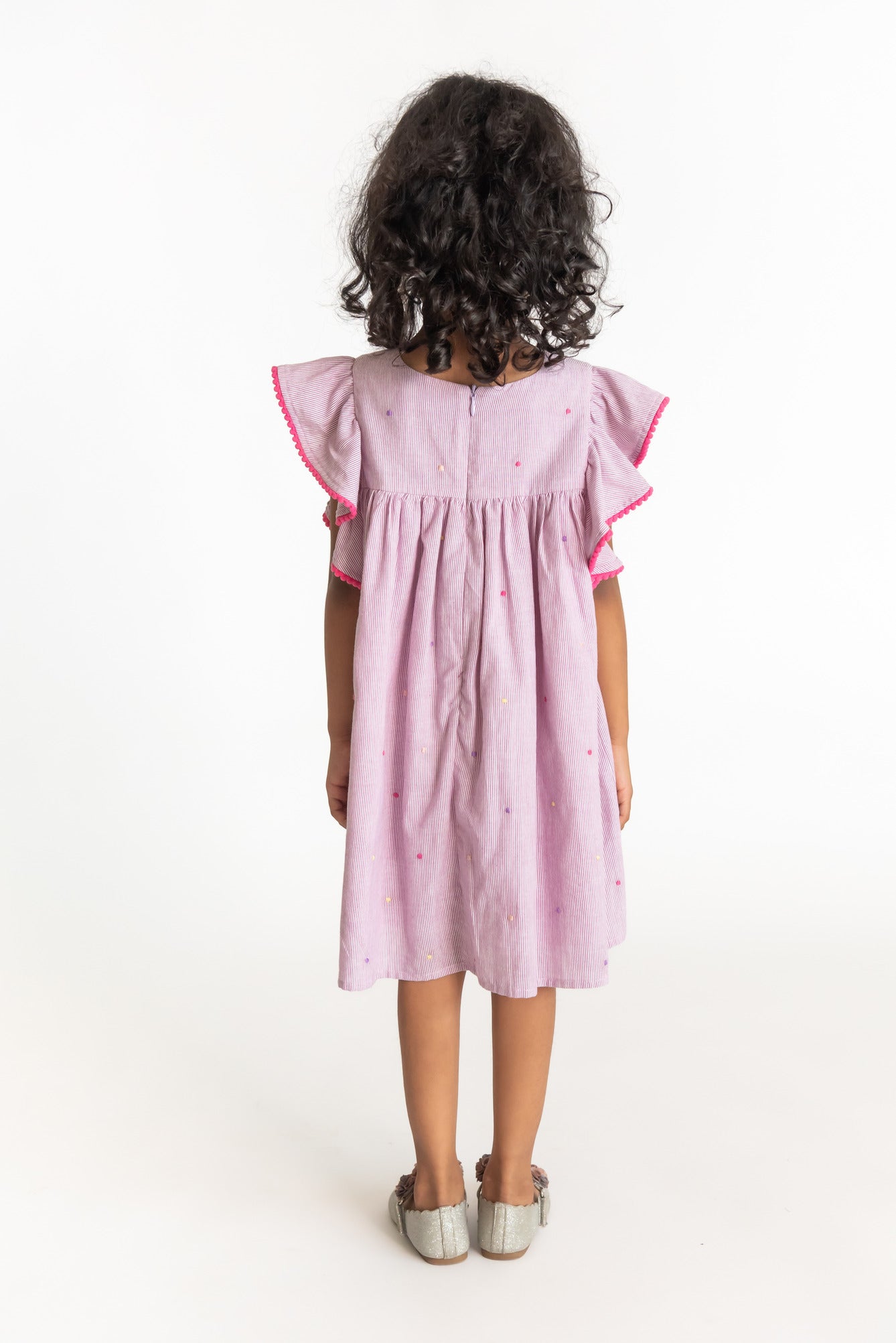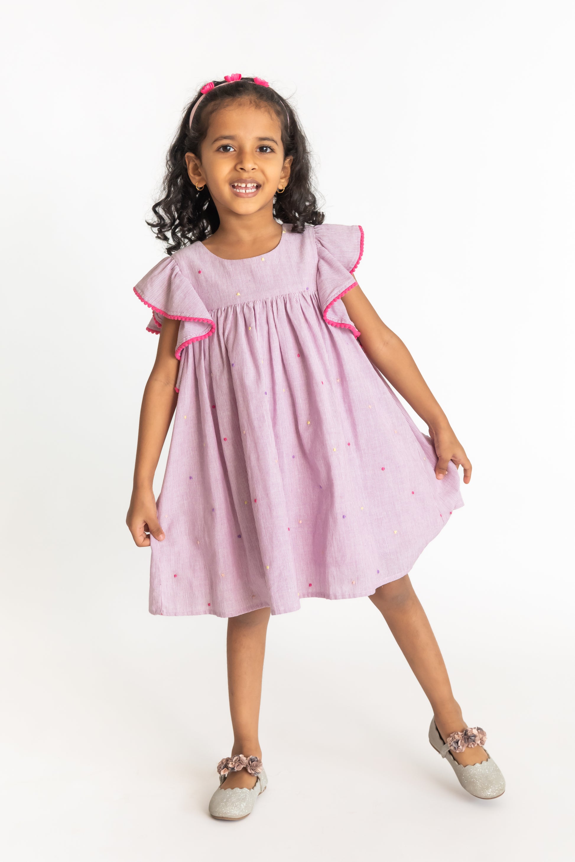 Our dot lilac dress is an adorable striped dress with multi coloured embroidery. The dress features a flared sleeve with an A-line dress with embroidery. Perfect for a day wear and any occasion. This dress has YKK zip fastening making it comfortable for the child to wear. This is a 100% cotton and are soft on skin