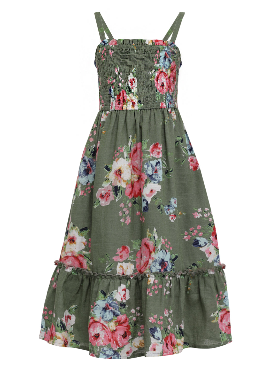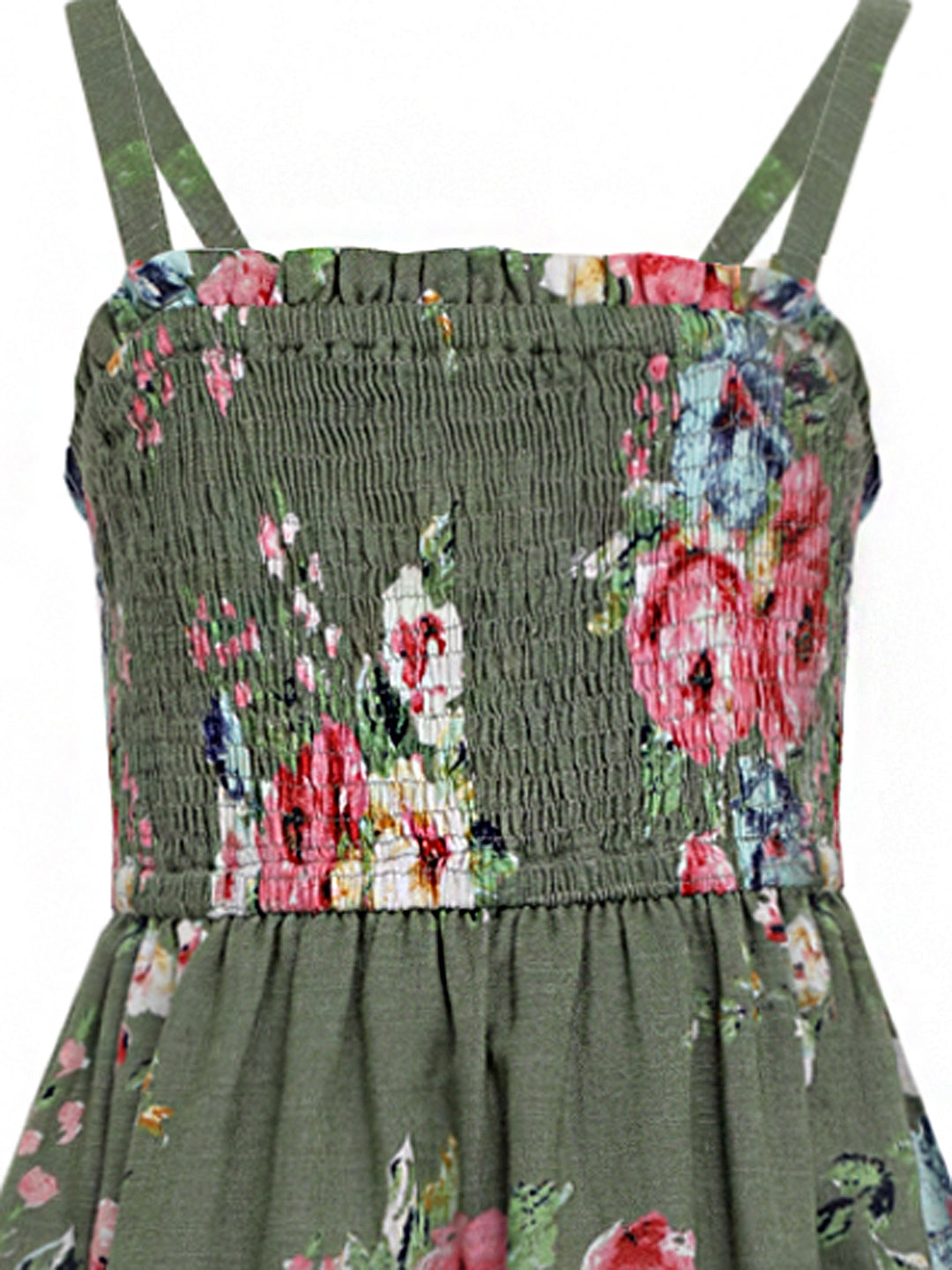 A floral green dress is a beautiful dress for casual get-togethers, crafted from light cotton in a charming print with a bottom tier. The skirt is softly gathered for added volume. The body is shirred for a snug, comfortable fit.