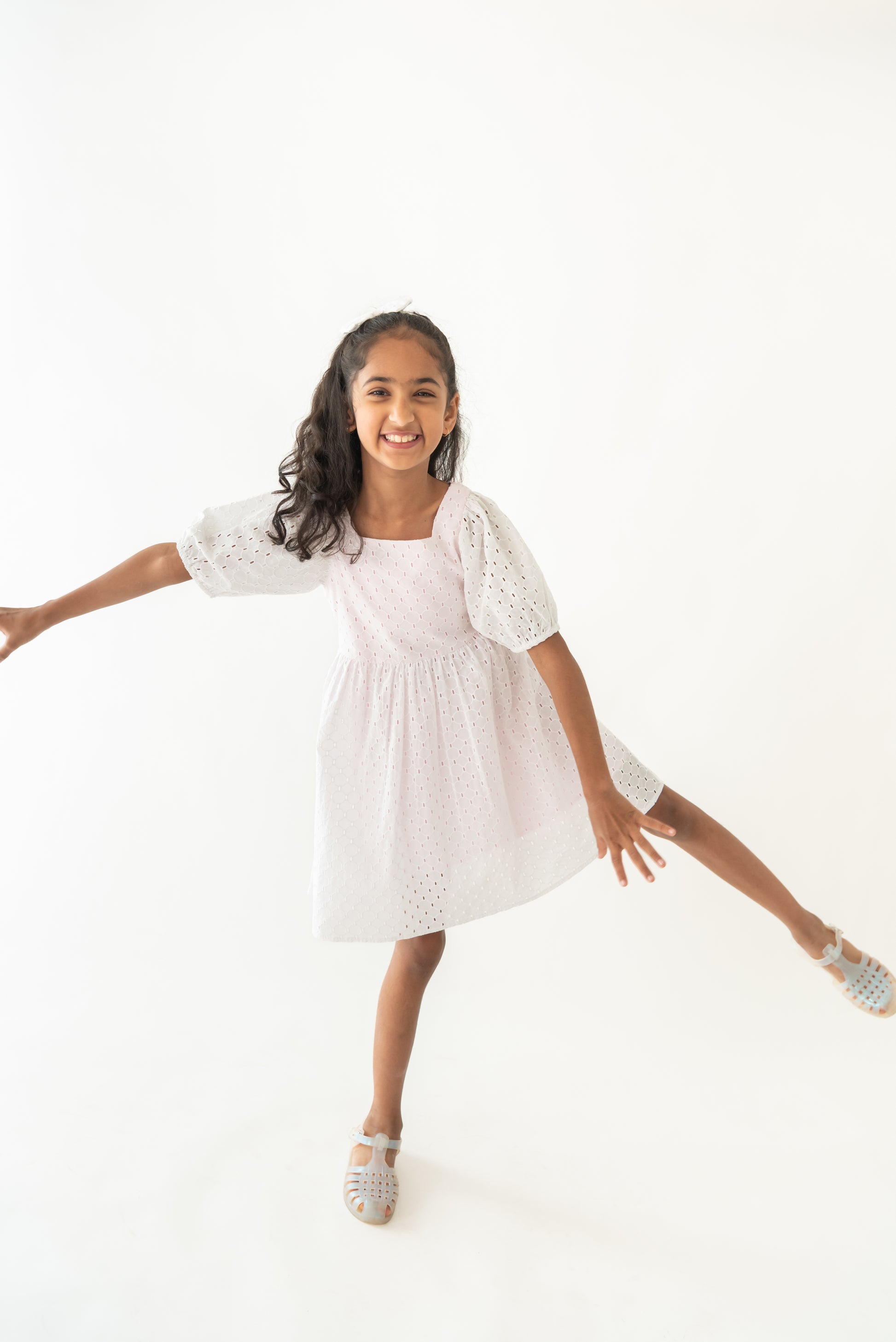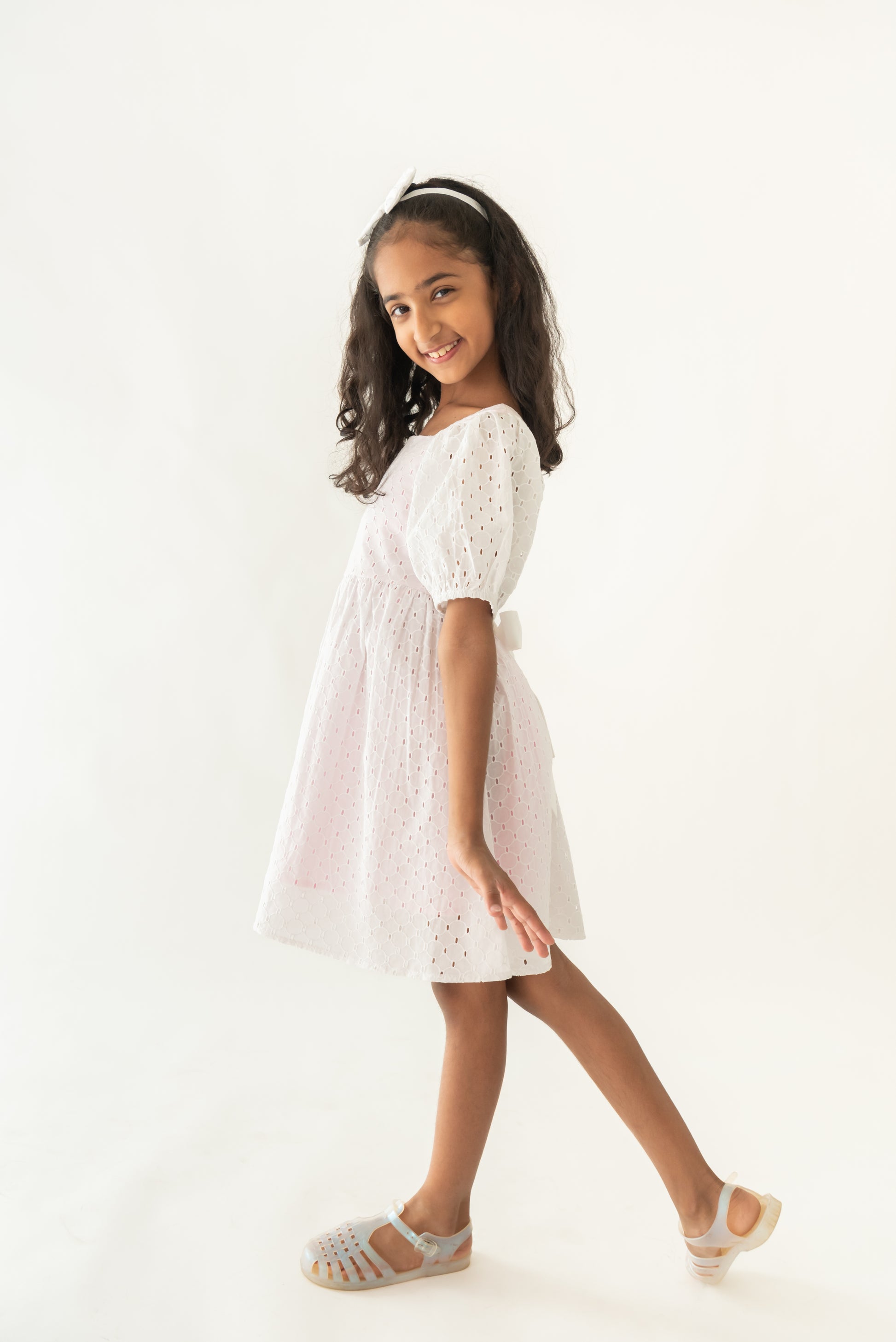 A chic white embroidered dress in white with puffed sleeves is all your doll could desire. A meticulously made dress in schiffli, is a fit and flare dress . It' s comfortable to wear and has a zipper fastening at the back.