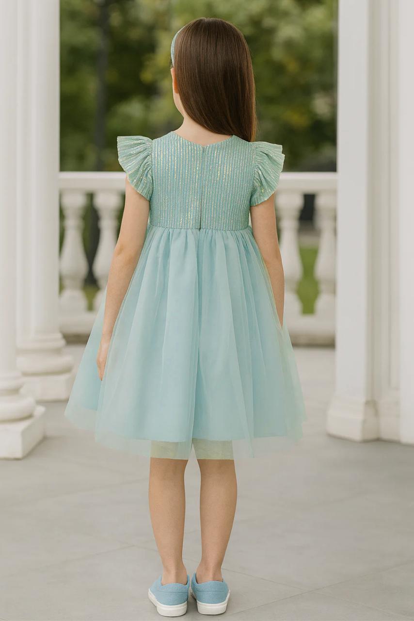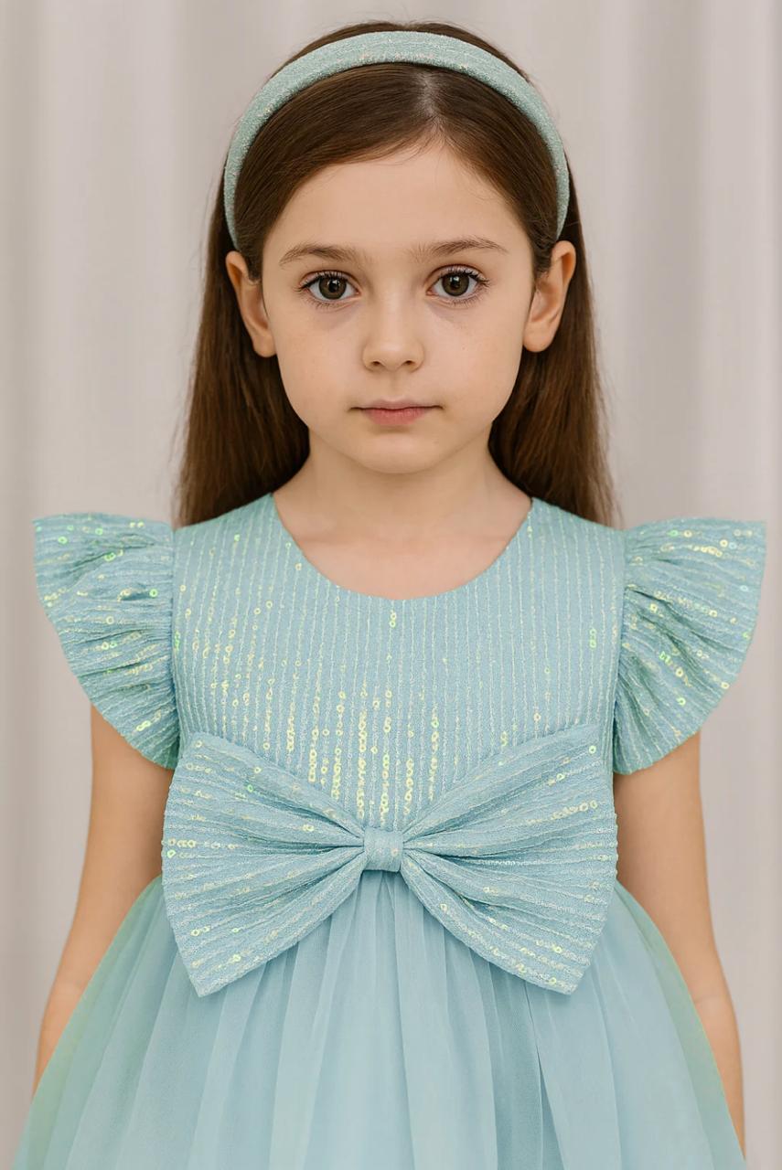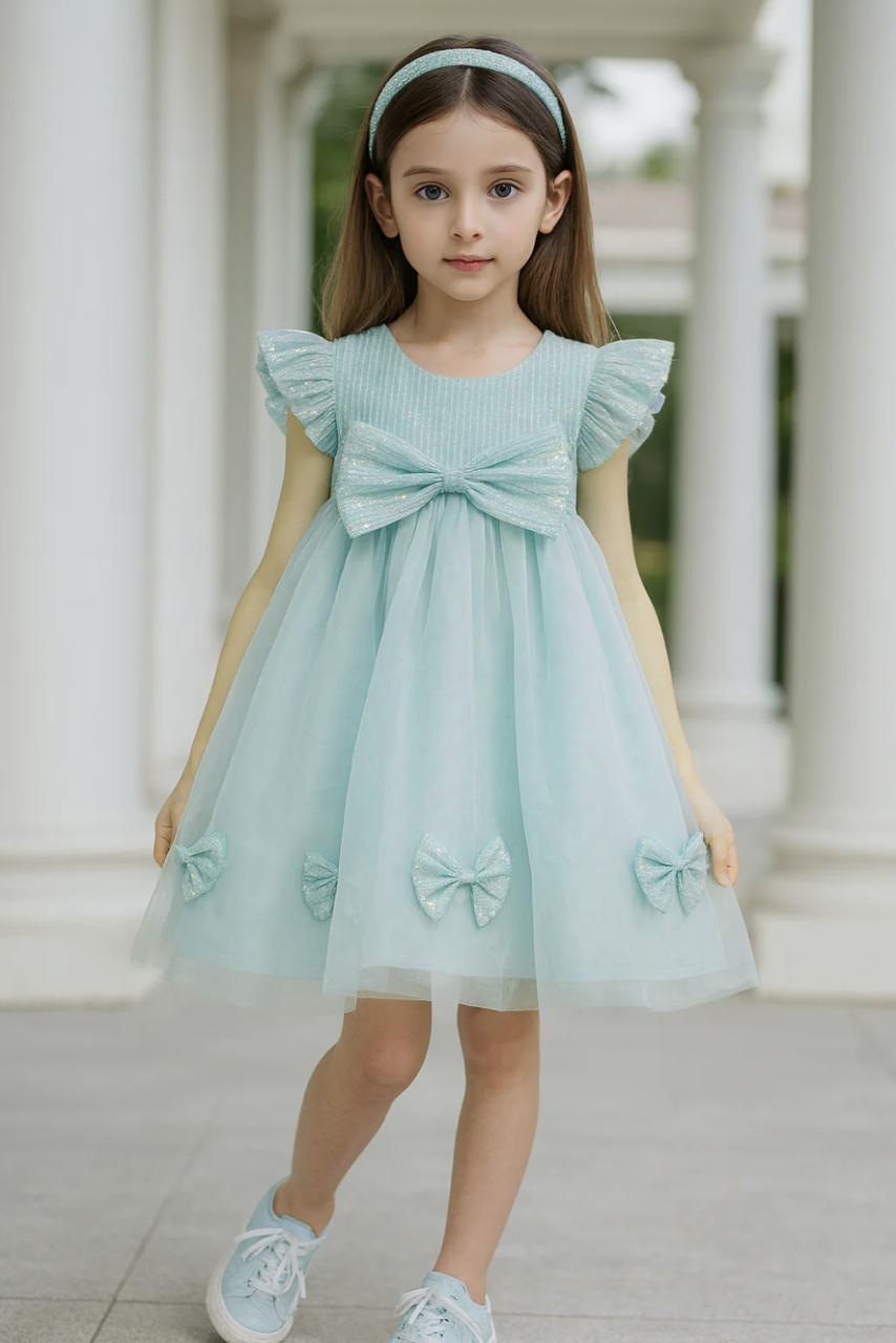 A dreamy light blue tutu dress featuring a sequin-embellished bodice, flutter sleeves, and a statement shimmer bow. The soft tulle skirt is adorned with delicate sequin bows, adding magical charm. Fully lined by cotton, it is light and airy making it ideal for all special occasions. Fastens at the back with a zipper.