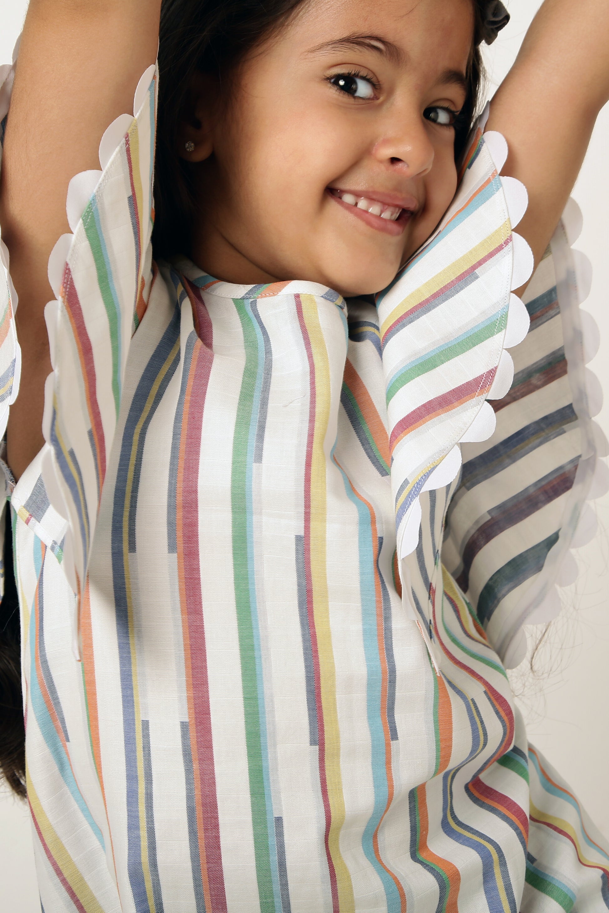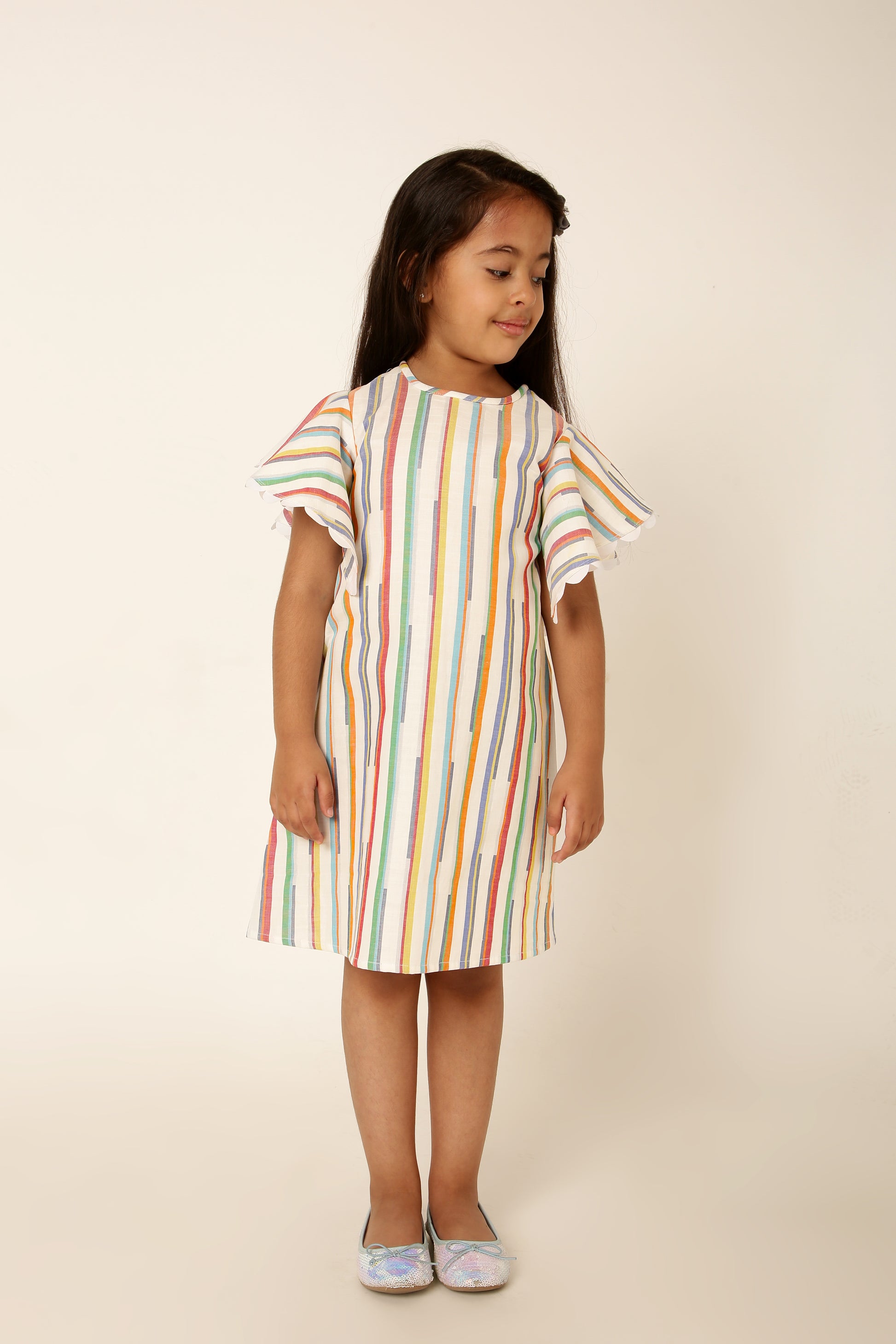 A trendy dress in stripe double cloth adds an alluring look to spring wardrobe. With scallops on sleeves gives it ansimple yet stylish look. This dress is made with soft cotton and YKK zip fastening makes it comfortable for the child to wear.