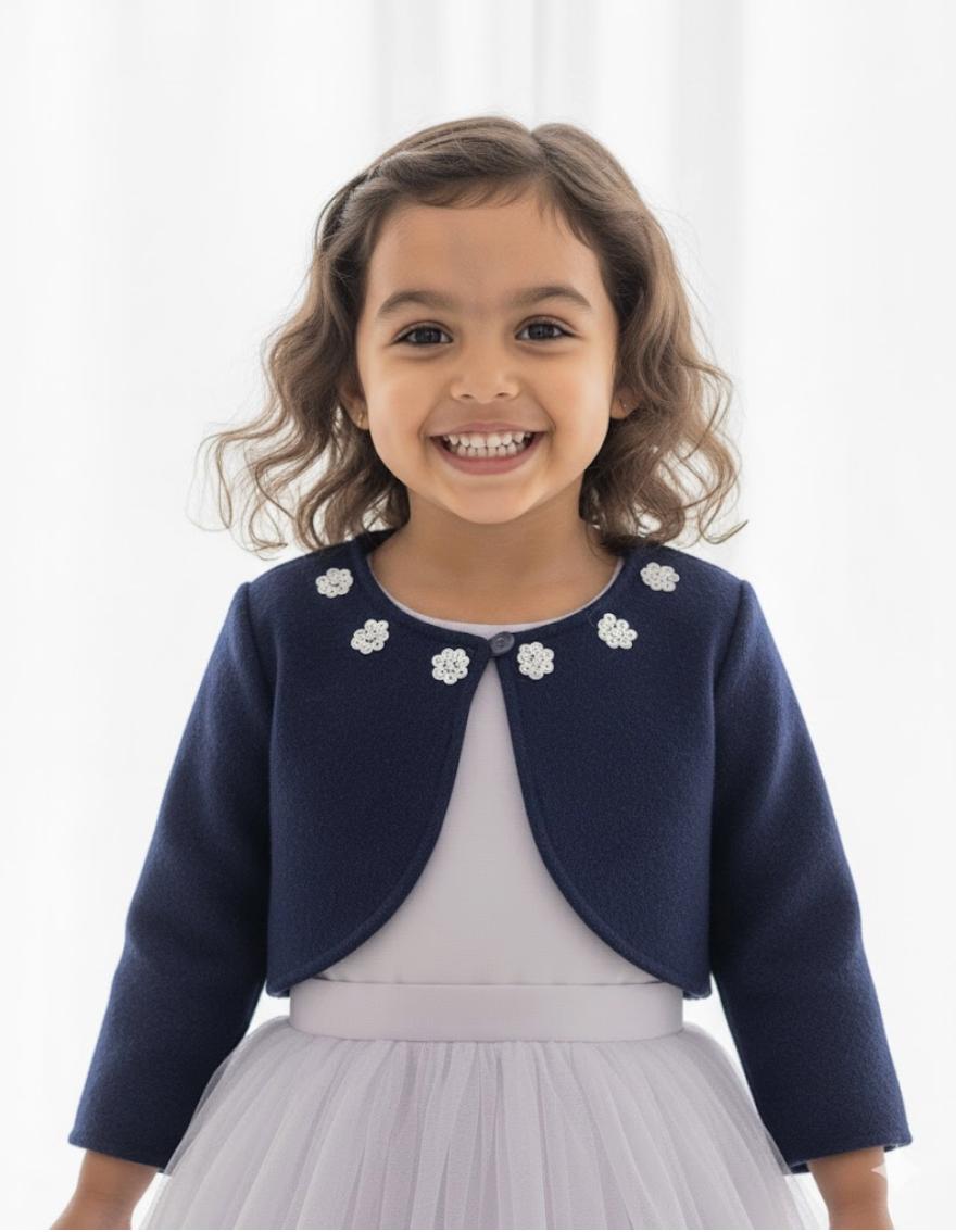 This adorable shrug in wool is warm and chic has beautiful sequin flower design.It will keep your kid comfortable all day long! It has a circular neck and front button closure for easy access and fuss free dressing.