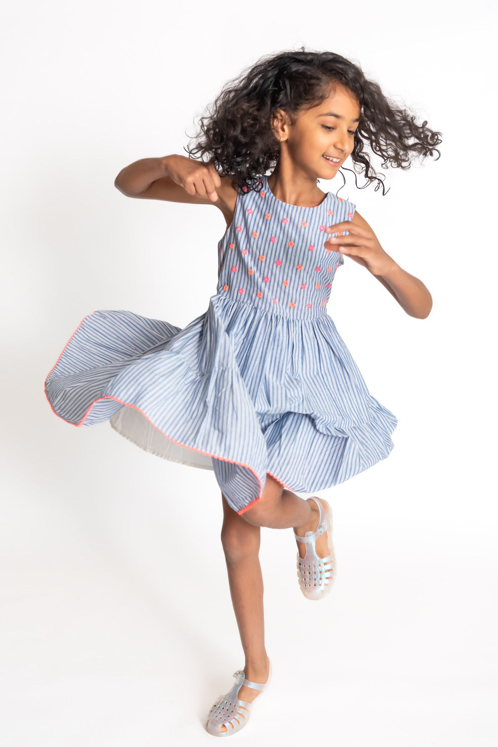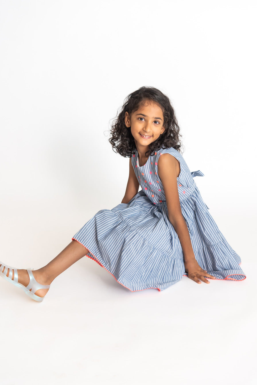 Neon nostalgia dress is a comfortable chic dress in blue and white stripe. A perfect wear for a play date or a vacation. It features beautiful neon flower embroidery on the yoke and neon lace detail on the seam. The dress is made in 100% cotton, it's a cool casual sleeveless dress and is soft and easy to wear.