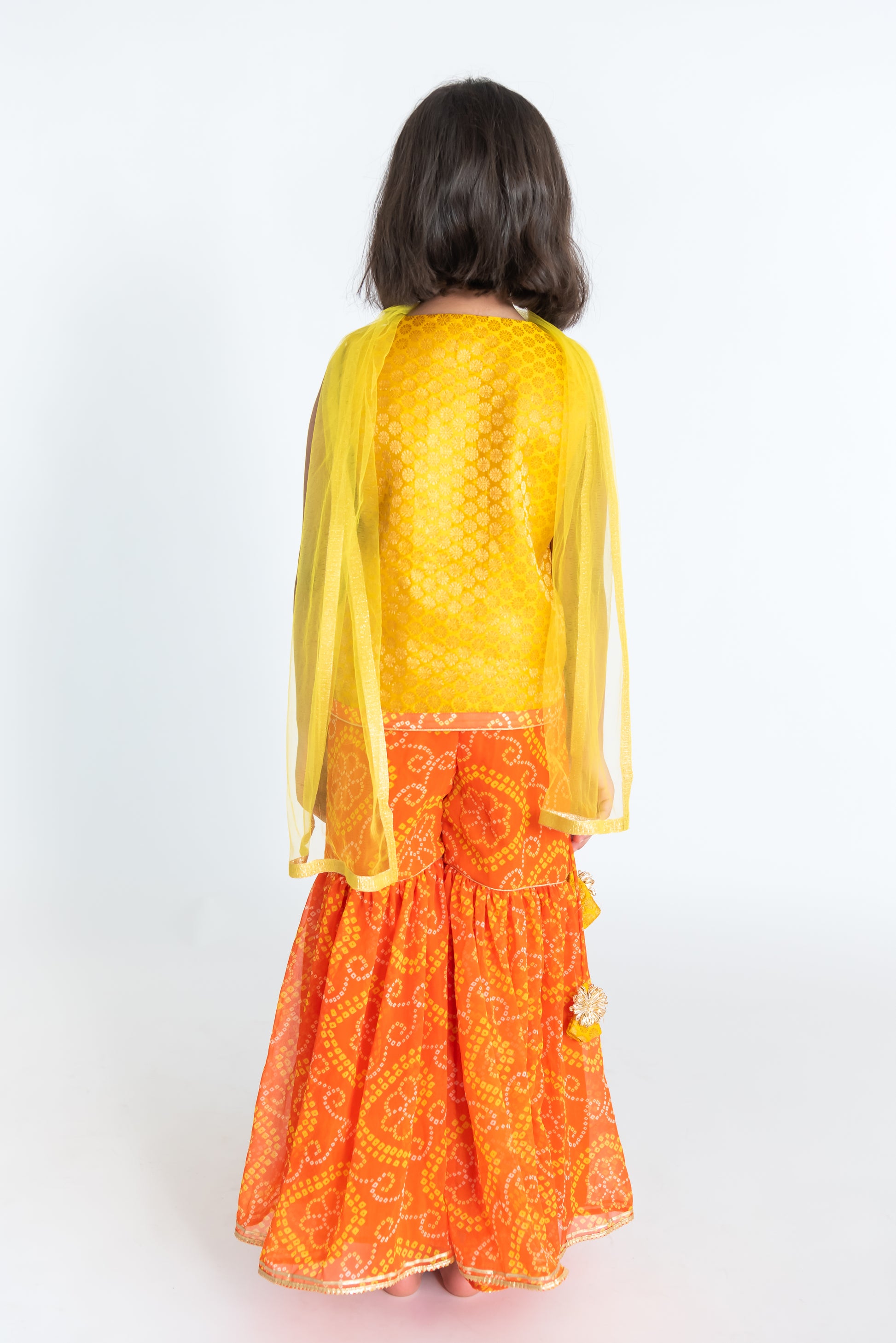 An excellent pick for your fashionista who'll stand out in any special occasion in this sharara choli set. With a yellow benaras jacquard choli with front buttons, the orange georgette bandhni sharara is made with a beautiful print and a gota border with a tulle dupatta matching with the lehnga.