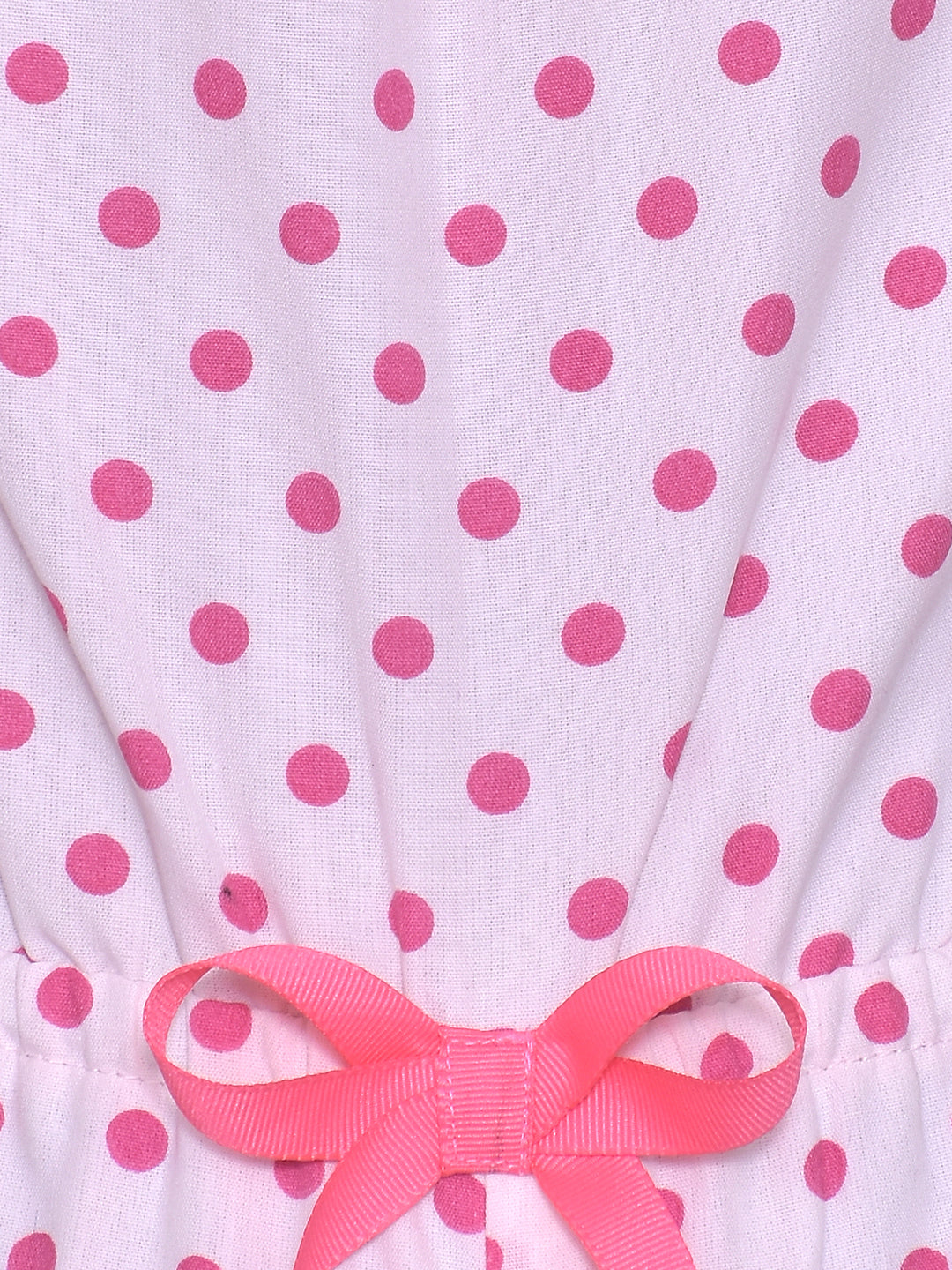 An adorable jumpsuit in polka print. This all-in-one features a ruffle on the yoke with contrast colour pink tassel! Designed in soft cotton to make this extremely comfy.