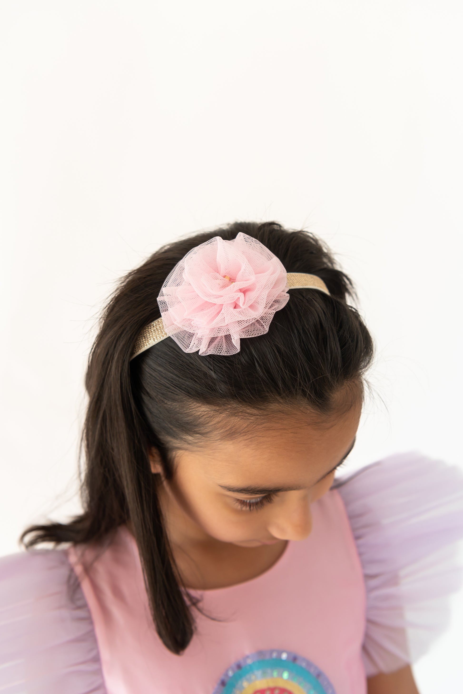 This pretty pink headband is soft and comfortable for baby's delicate head, matches all pink colored dresses. It has tylle 3D flower meticulously hand-embroidered on an elasticated band.
