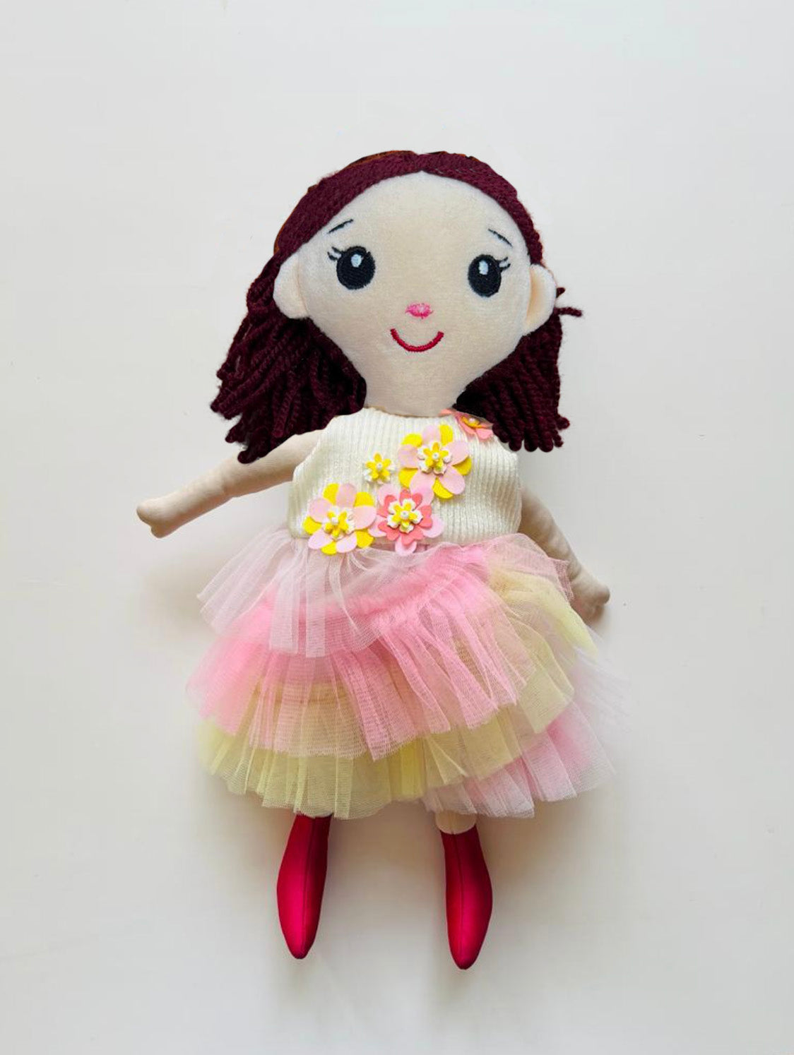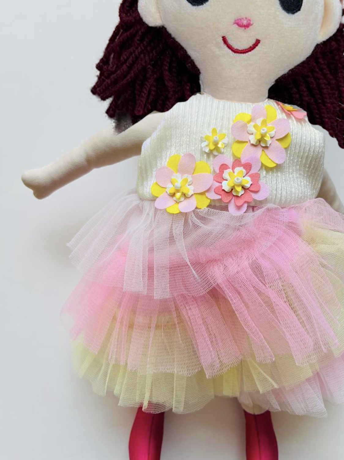 Material: Handmade Polyester fabric doll with tutu dress and handmade flowers