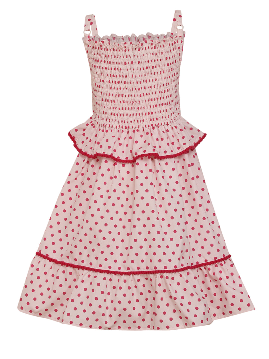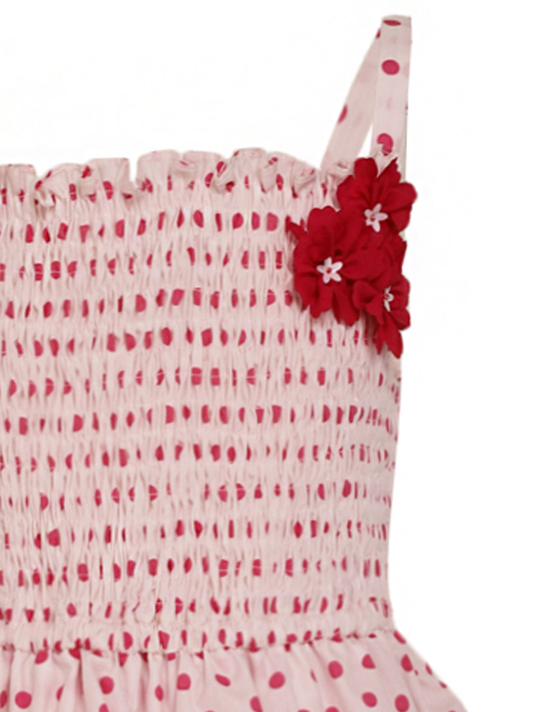 This polka dot casual dress features smocking, lace and 3D flower detail. A smart comfortable outfit for a day outing. This dress is a slip on dress made in 100% cotton and is soft and easy to wear.