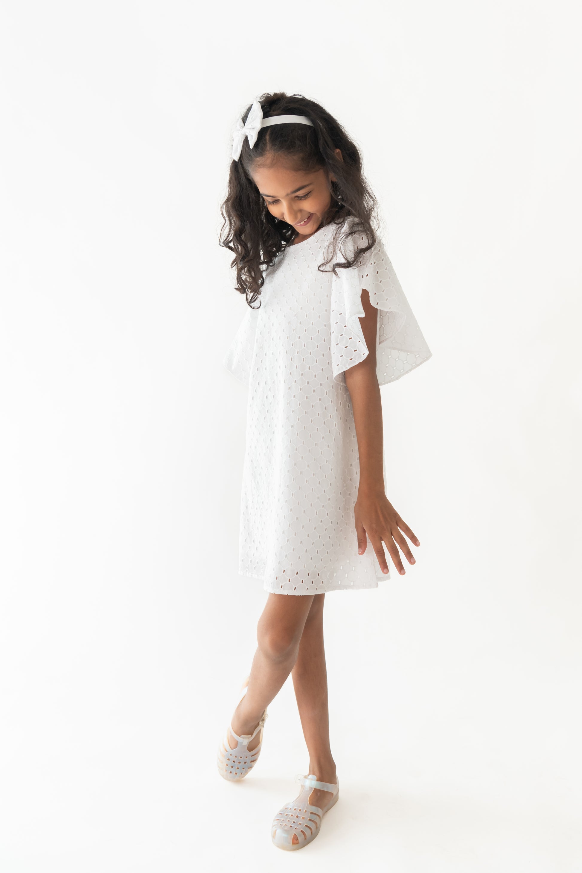 A chic white embroidered outfit in white with flared sleeves is all your doll could desire. A meticulously made dress in schiffli, is an A-line dress . It' s comfortable to wear and has a zipper fastening at the back.