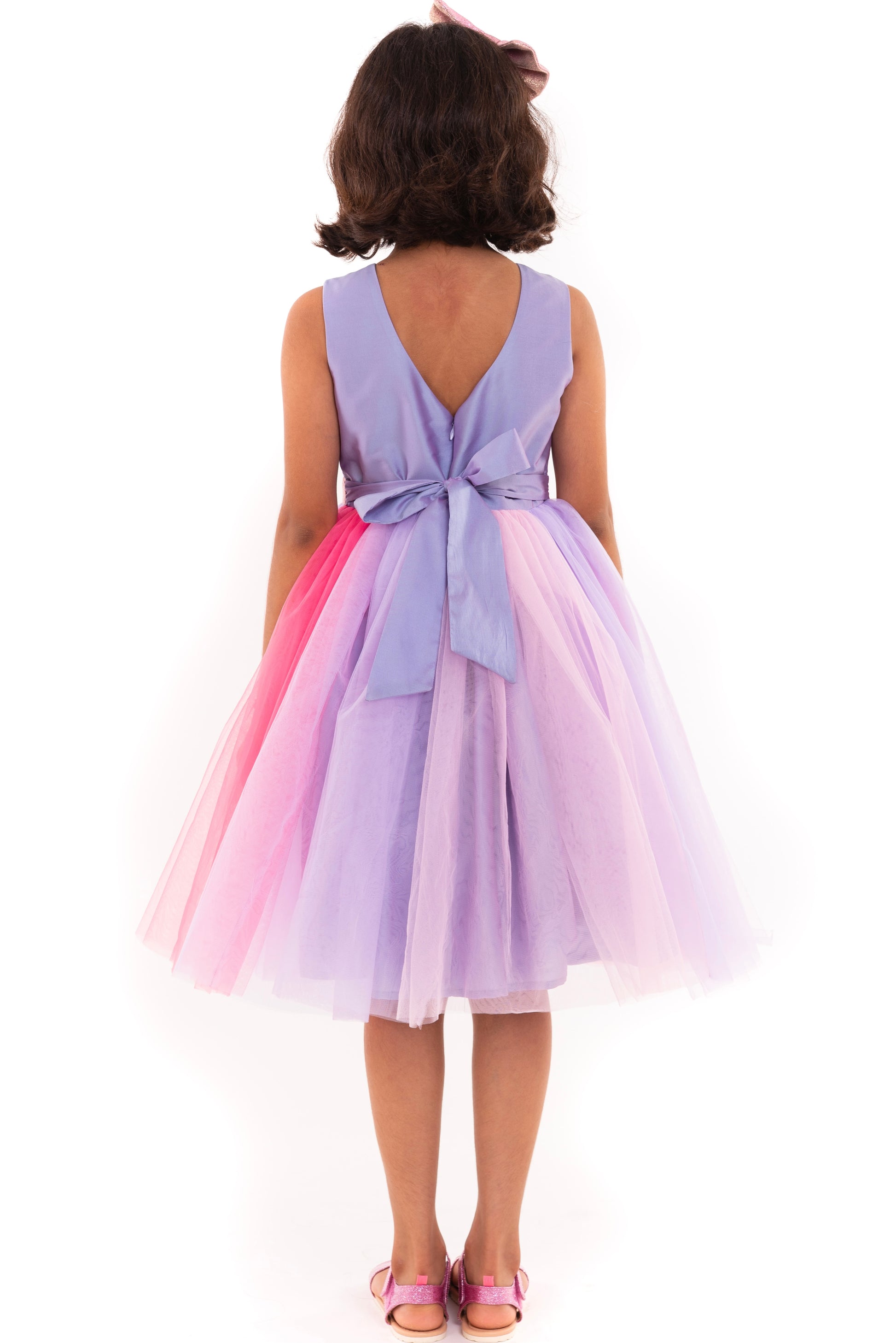 Keeping the fascination alive this stunning rainbow unicorn dress features a hand embroidered unicorn with sequins detailing on top. The fully lined bodice flows into a voluminous mesh lined skirt in pastel colors. The back of the dress features a zip closure. Accessories used by the model are not included with the dress, can be purchased separately.