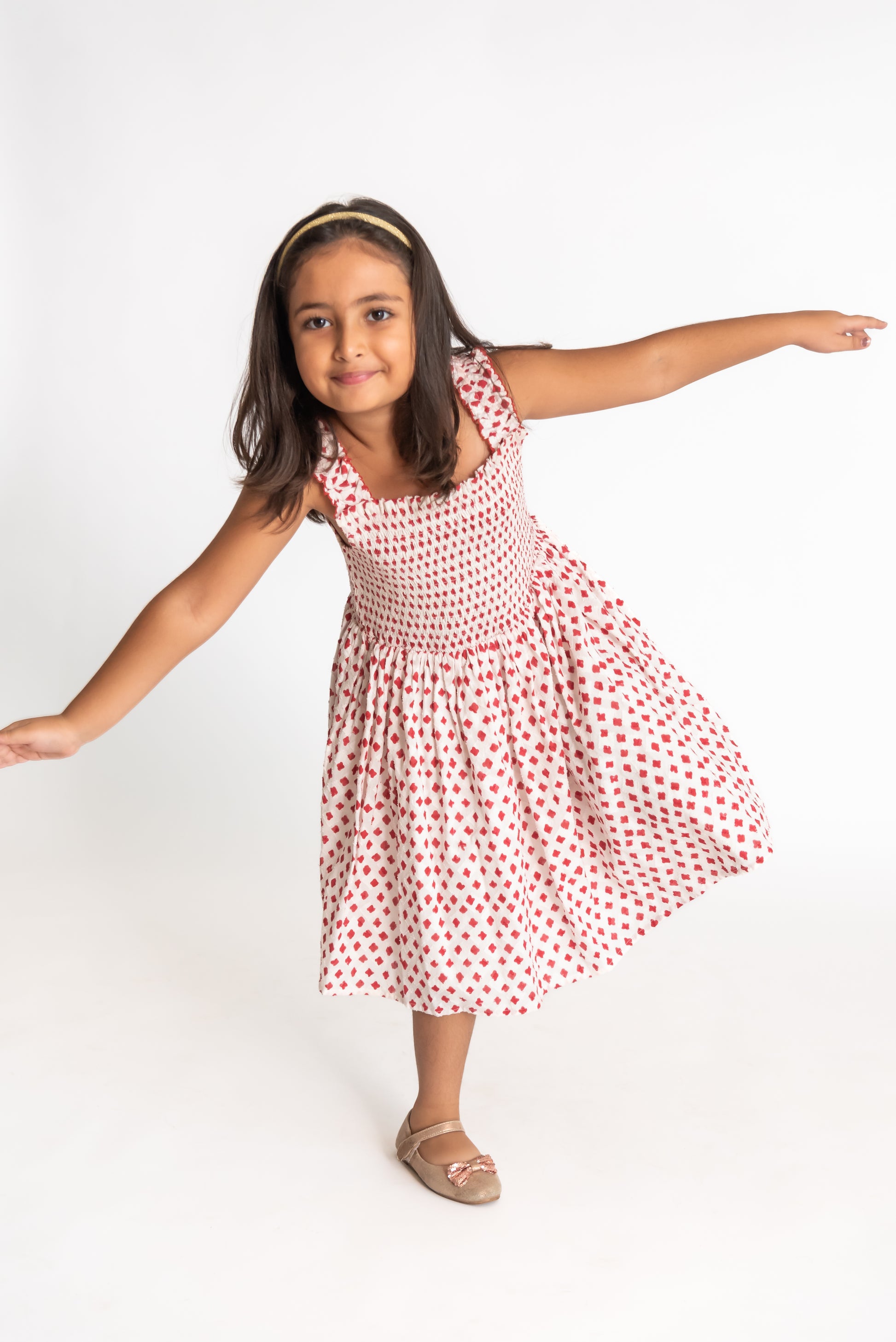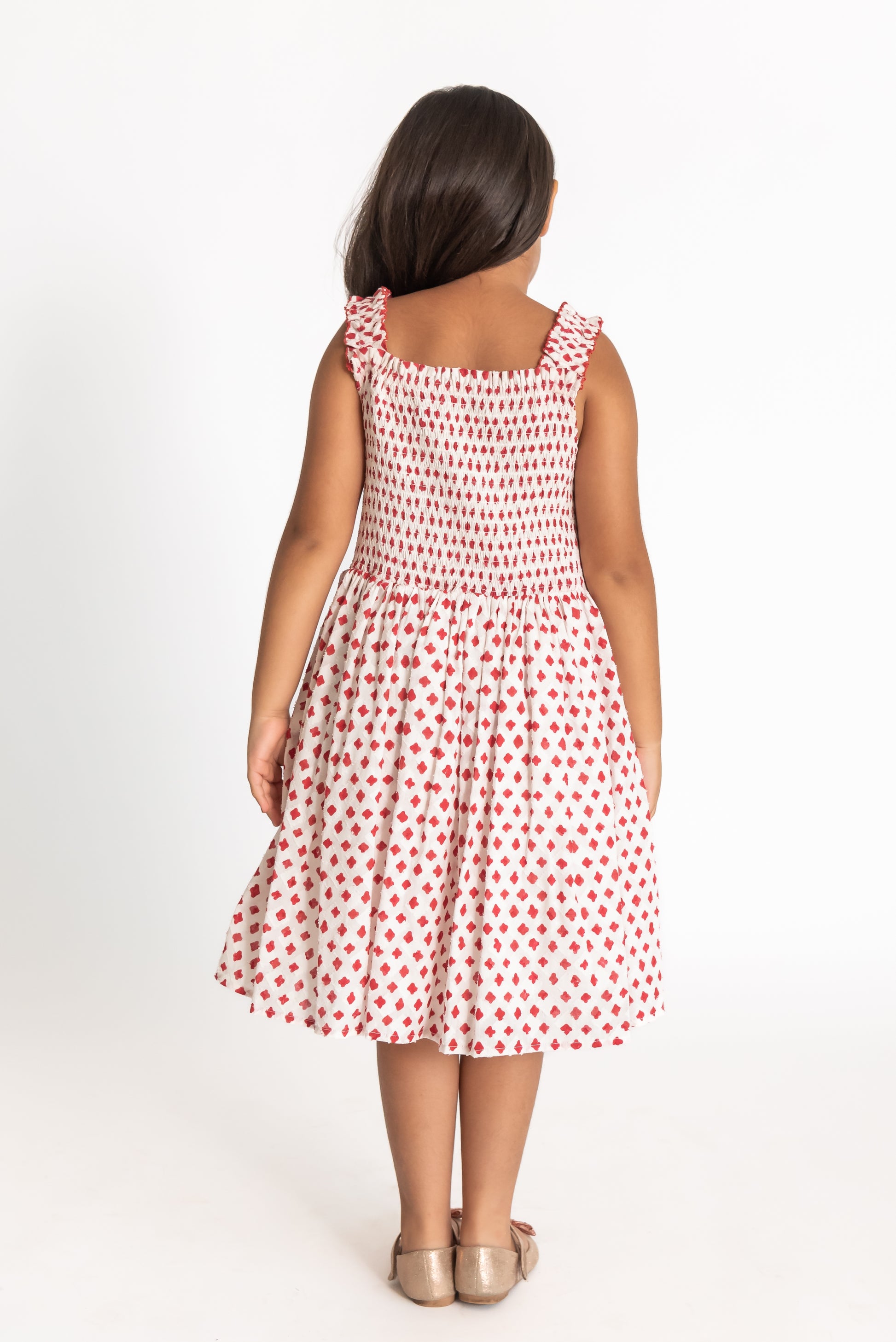 A block print cotton casual dress is a comfortable casual dress with smocked detail on body and straps. A smart comfortable outfit for a day outing. This dress is a slip on dress made in 100% cotton and is soft and easy to wear.