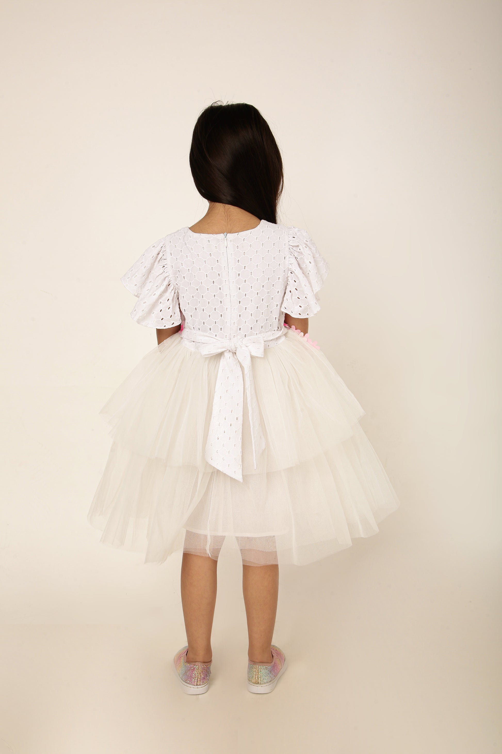 A charming dress in white is made on a cotton lace fabric with tulle flounce skirt. Meticulously hand embroidered in 3D flowers, this dress is sure to make heads turn. This dress is made in cotton lace embroiedred fabric and YKK zip fastening makes it comfortable for the child to wear. Our products are soft on skin and have breathe easy cotton lining.