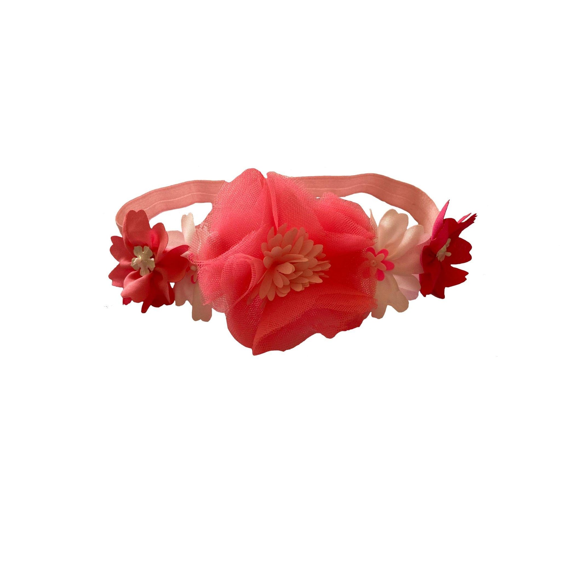 A beautiful headband matching with all pink dresses, this headband is embroidered with shades of pink 3D flowers and ruffled net on an elasticated band.