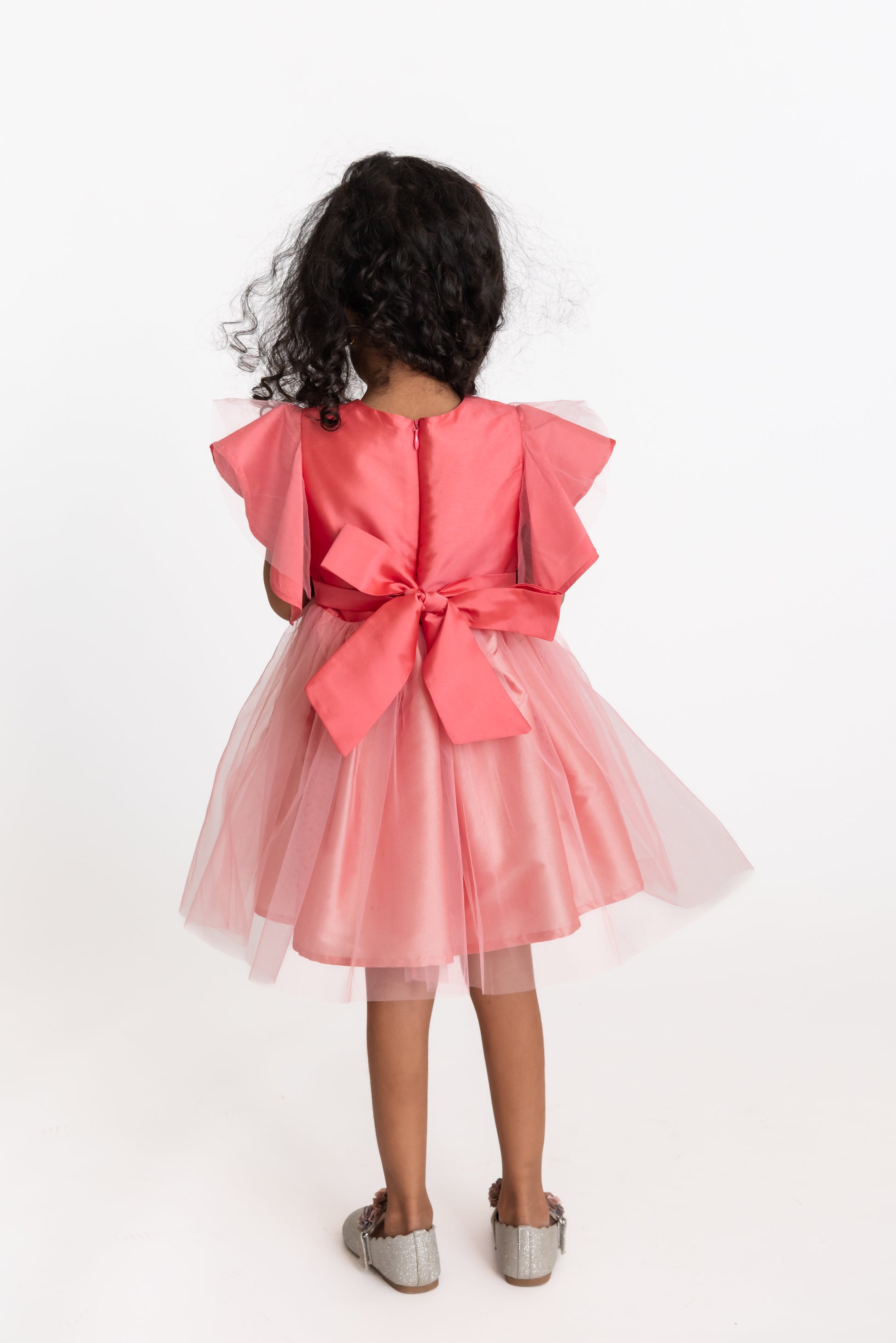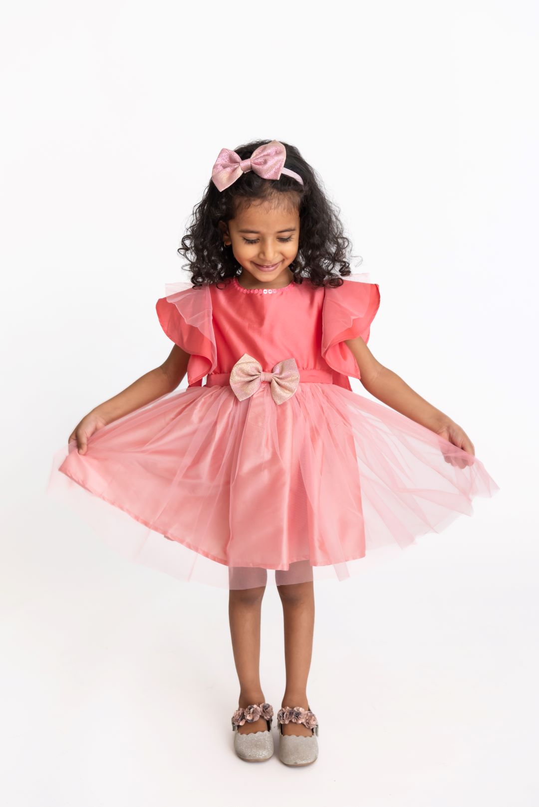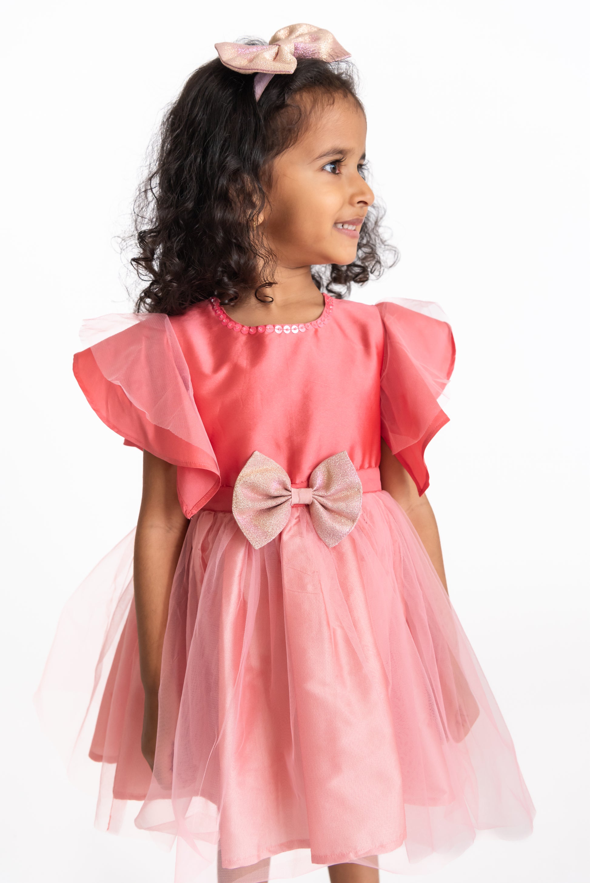 A flared dress in pink and carrot with flowing tulle skirt is embroidered with sequins and beads. Especially designed for a perfect fit, along with flared sleeves, this trendy outfit provides utmost comfort which will keep your baby looking super adorable.