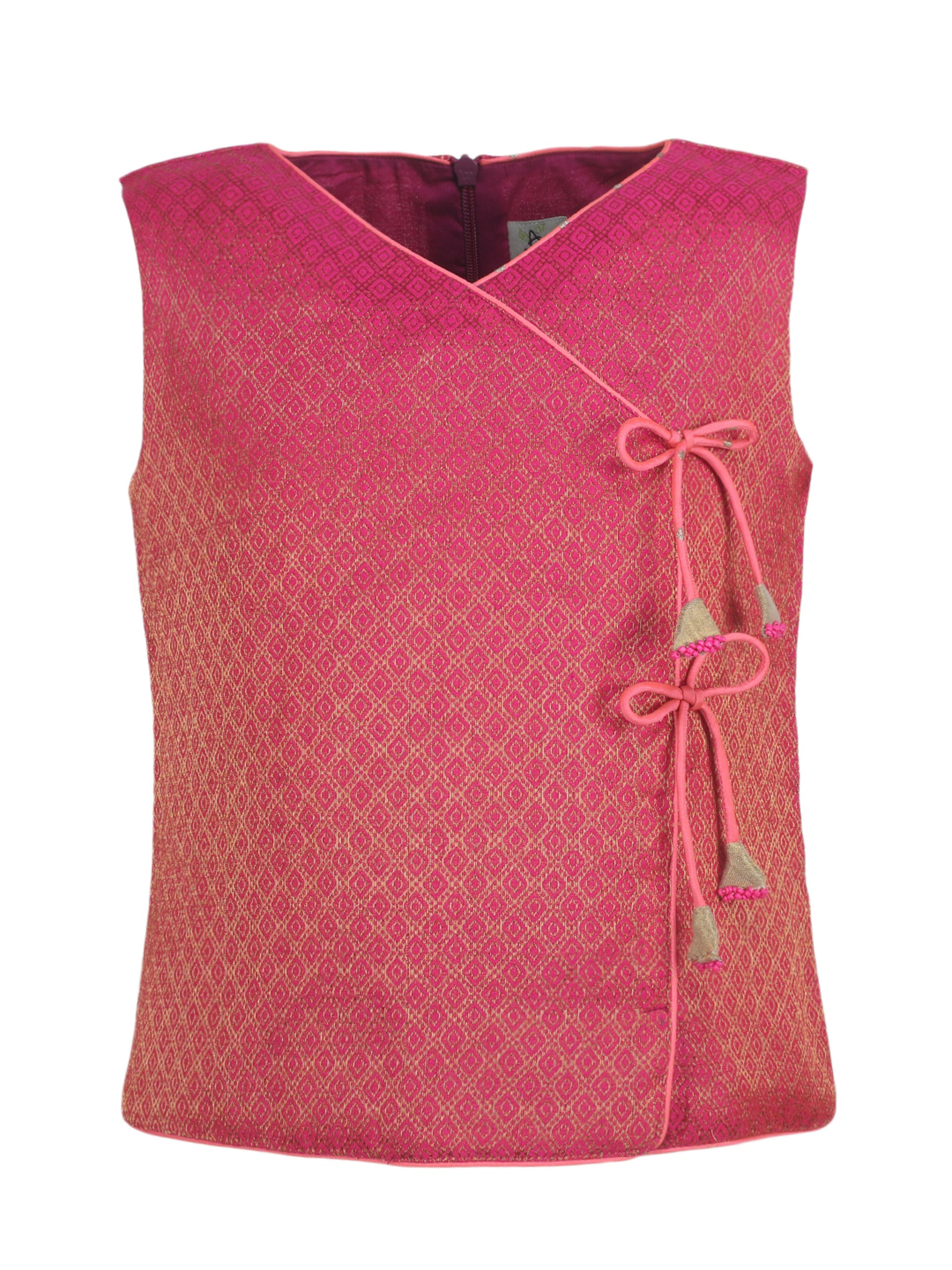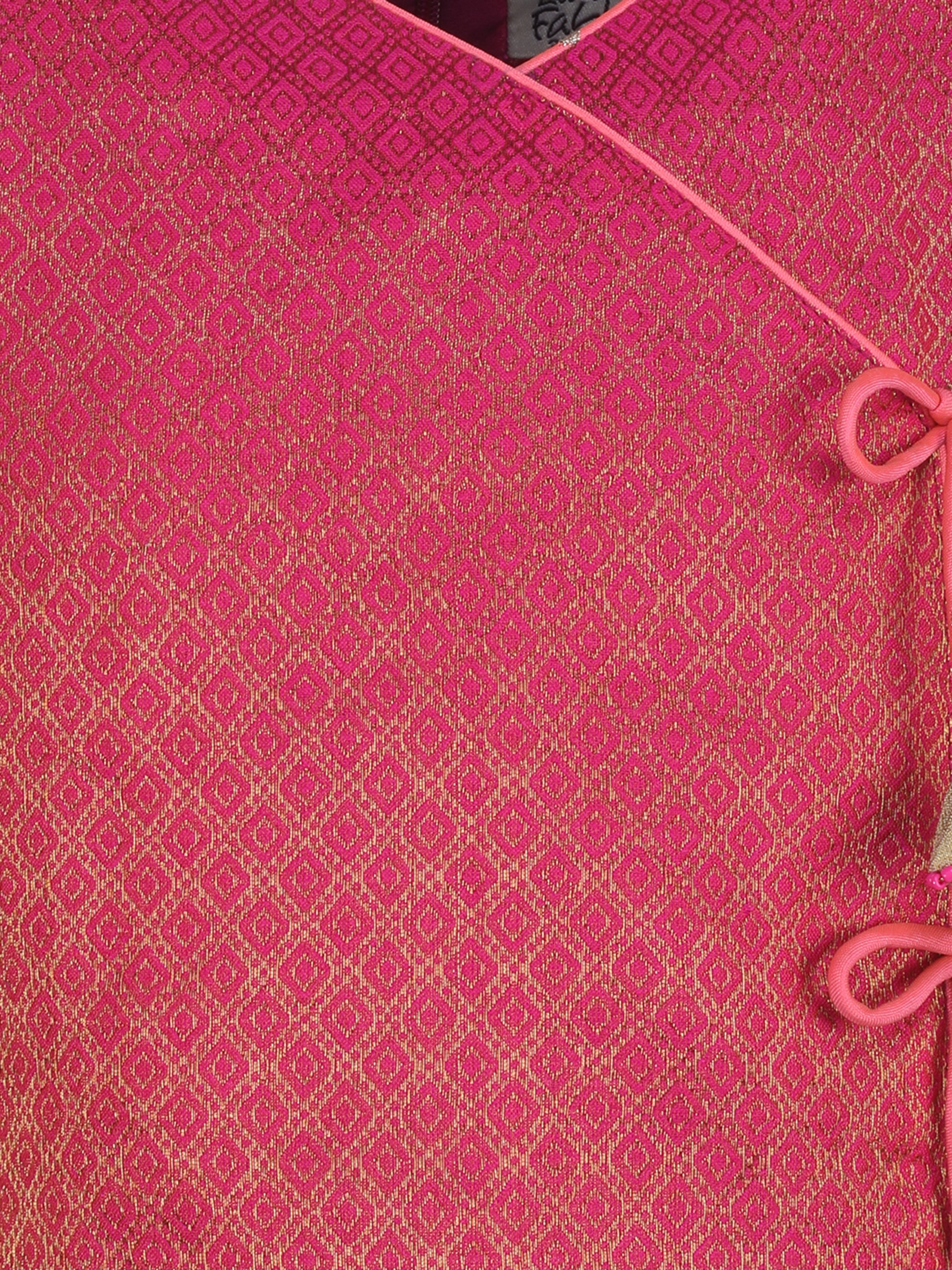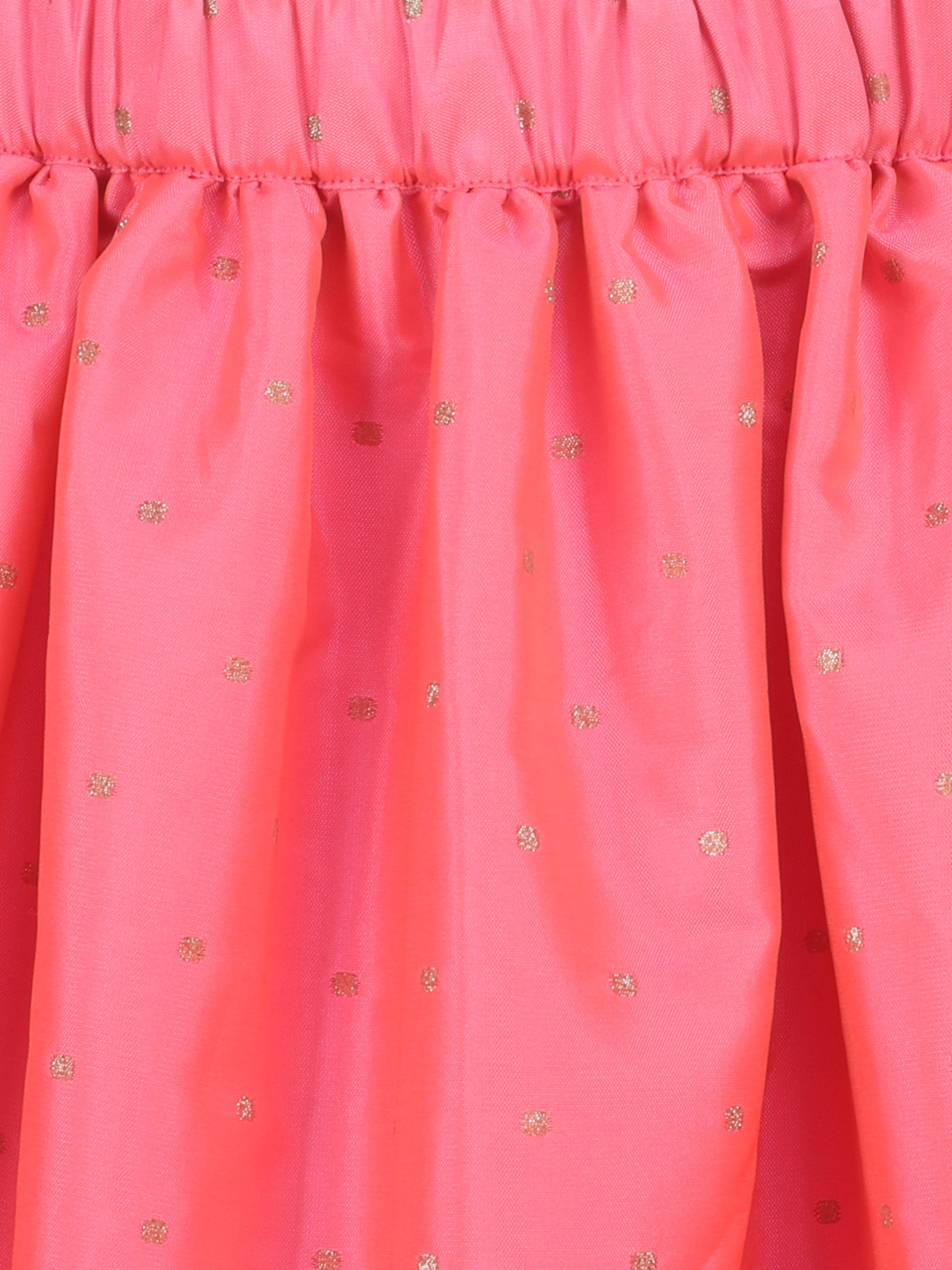 An excellent pick for your fashionista who'll stand out in the crowd in this lehnga choli set. With a pink benaras jacquard angarkha choli , the lehnga is a combination of beautiful dobby with a gota border and a tulle dupatta matching with the lehnga.