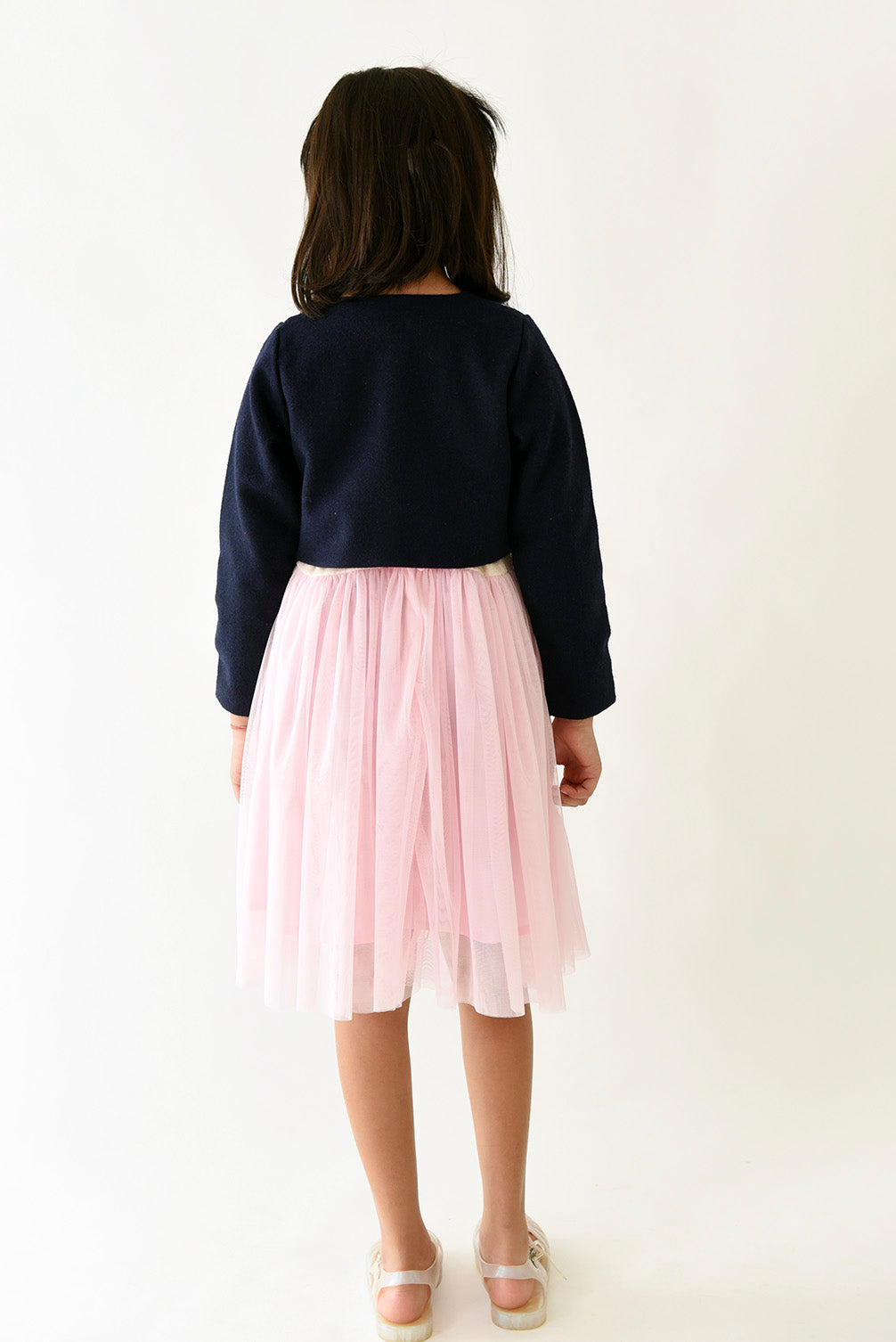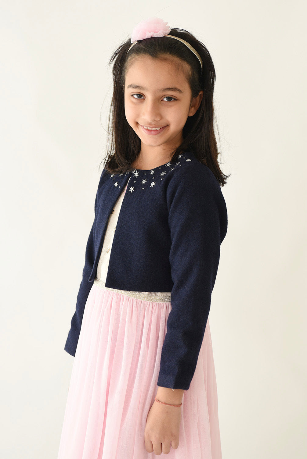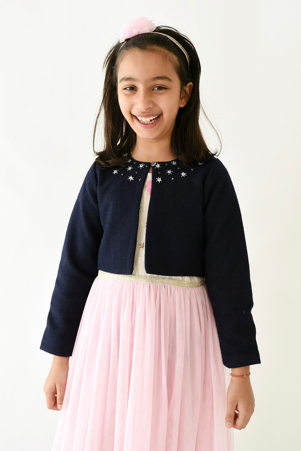 'A Little Fable presents a comfortable and warm wool shrug, tailor made for your little one. A shrug so gorgeous and delicately designed that it will certainly make your little one stand out at the party. A perfect winterwear, embellished with sequins and fastens with a single button. Layer it over her favourite dress.