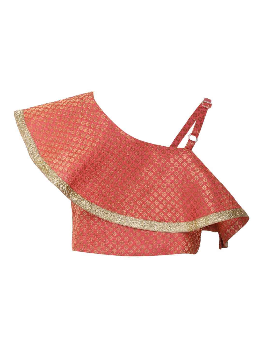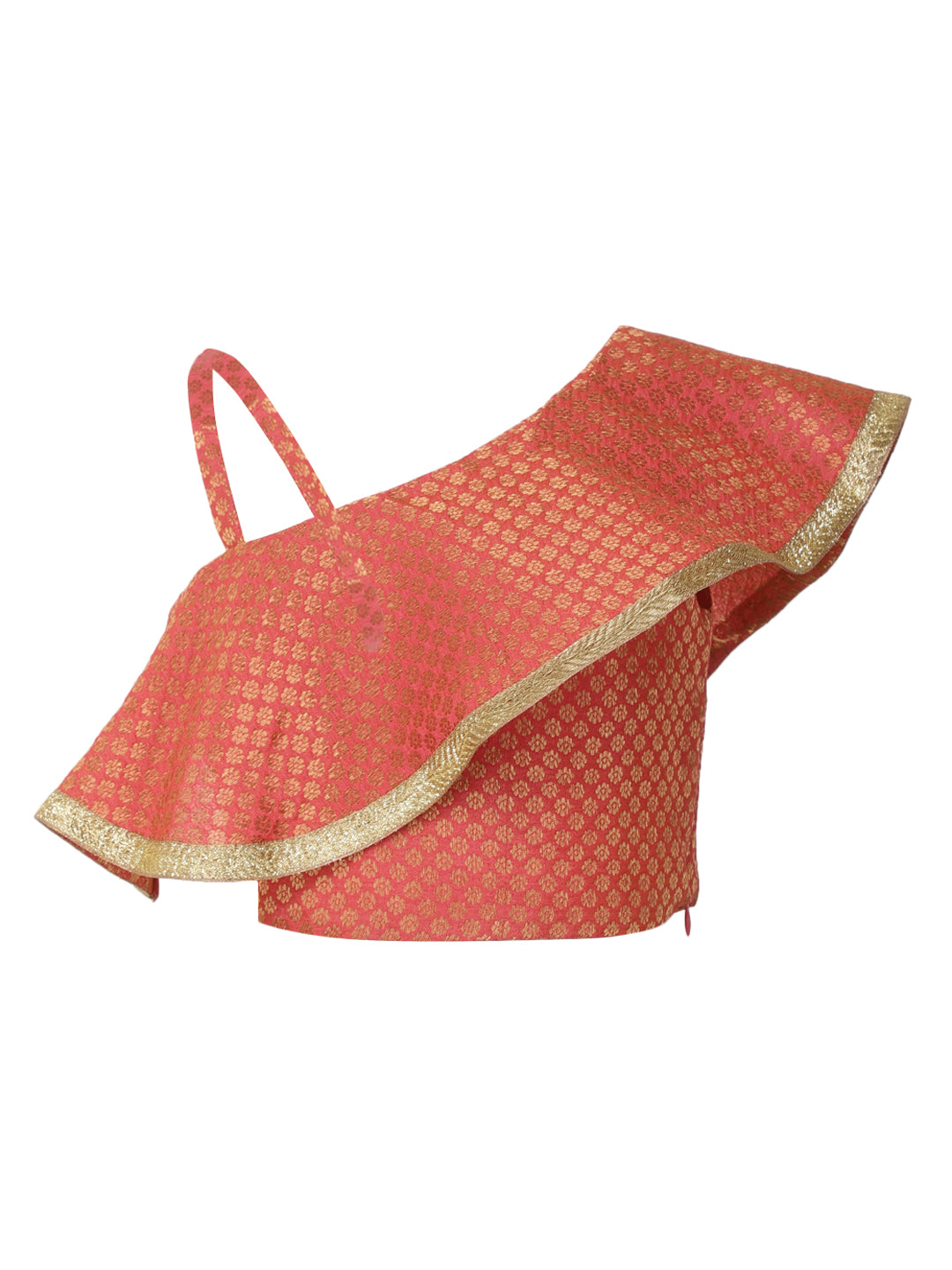 This lehnga set is stunning and comfortable. It features an asymmetric ruffle blouse in brocade and leheriya georgette dupatta in bright and fun color. The contrast lehnga adds to the fun element with matching border at the hem. Fully lined by cotton it has a zipper for easy fastening.