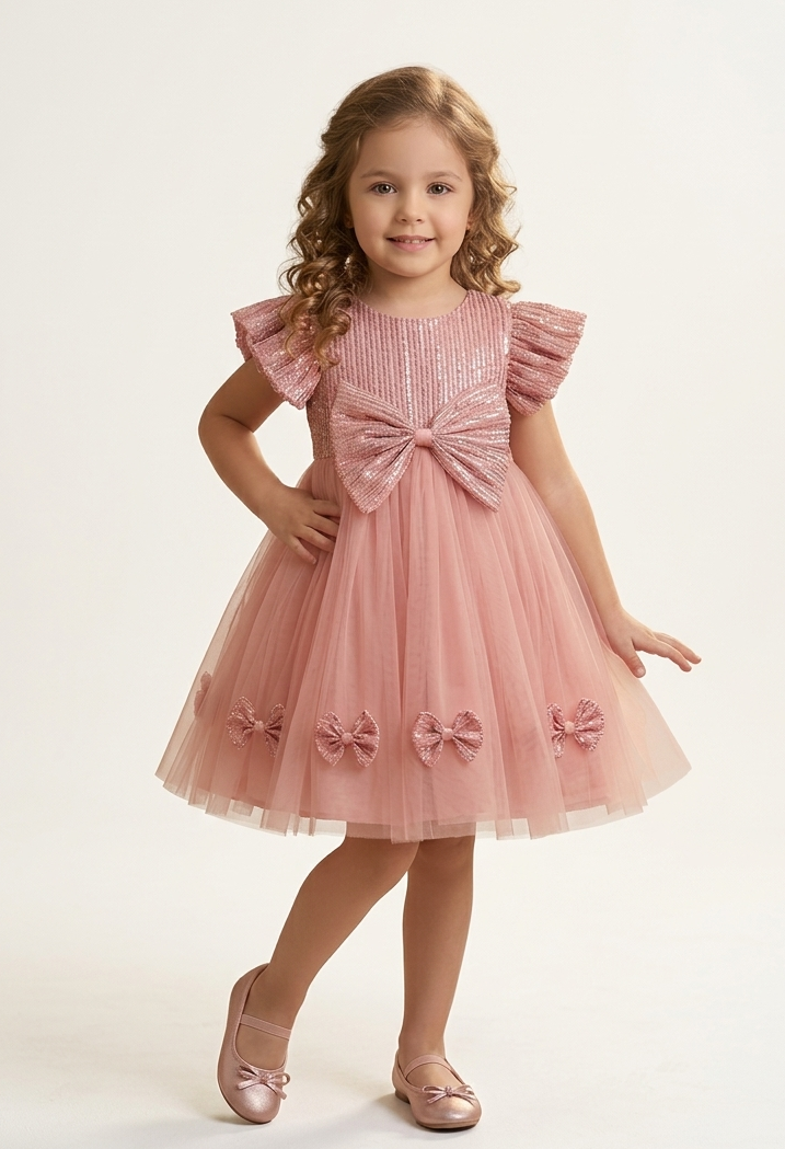 A dreamy light peach tutu dress featuring a sequin-embellished bodice, flutter sleeves, and a statement shimmer bow. The soft tulle skirt is adorned with delicate sequin bows, adding magical charm. Fully lined by cotton, it is light and airy making it ideal for all special occasions. Fastens at the back with a zipper.