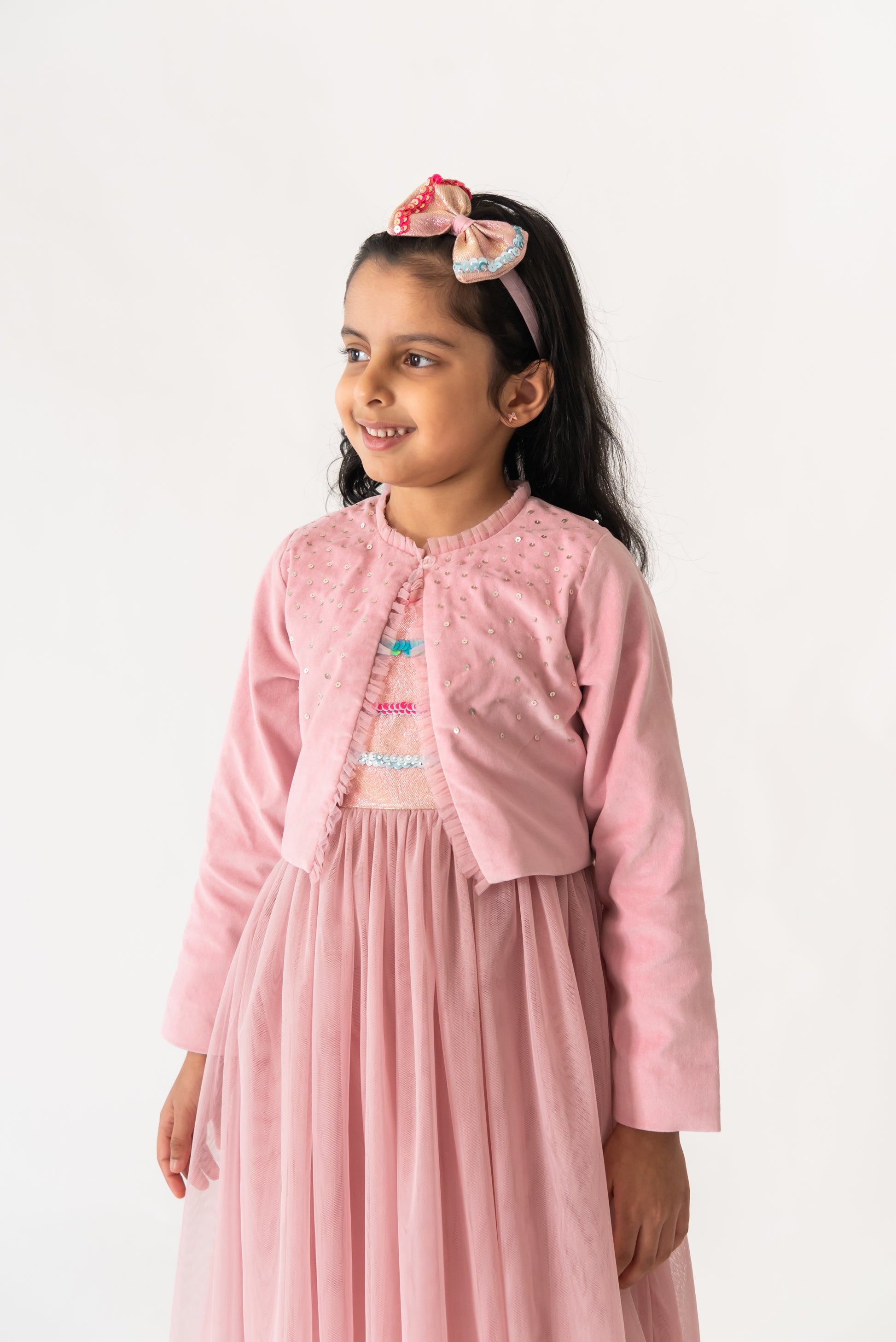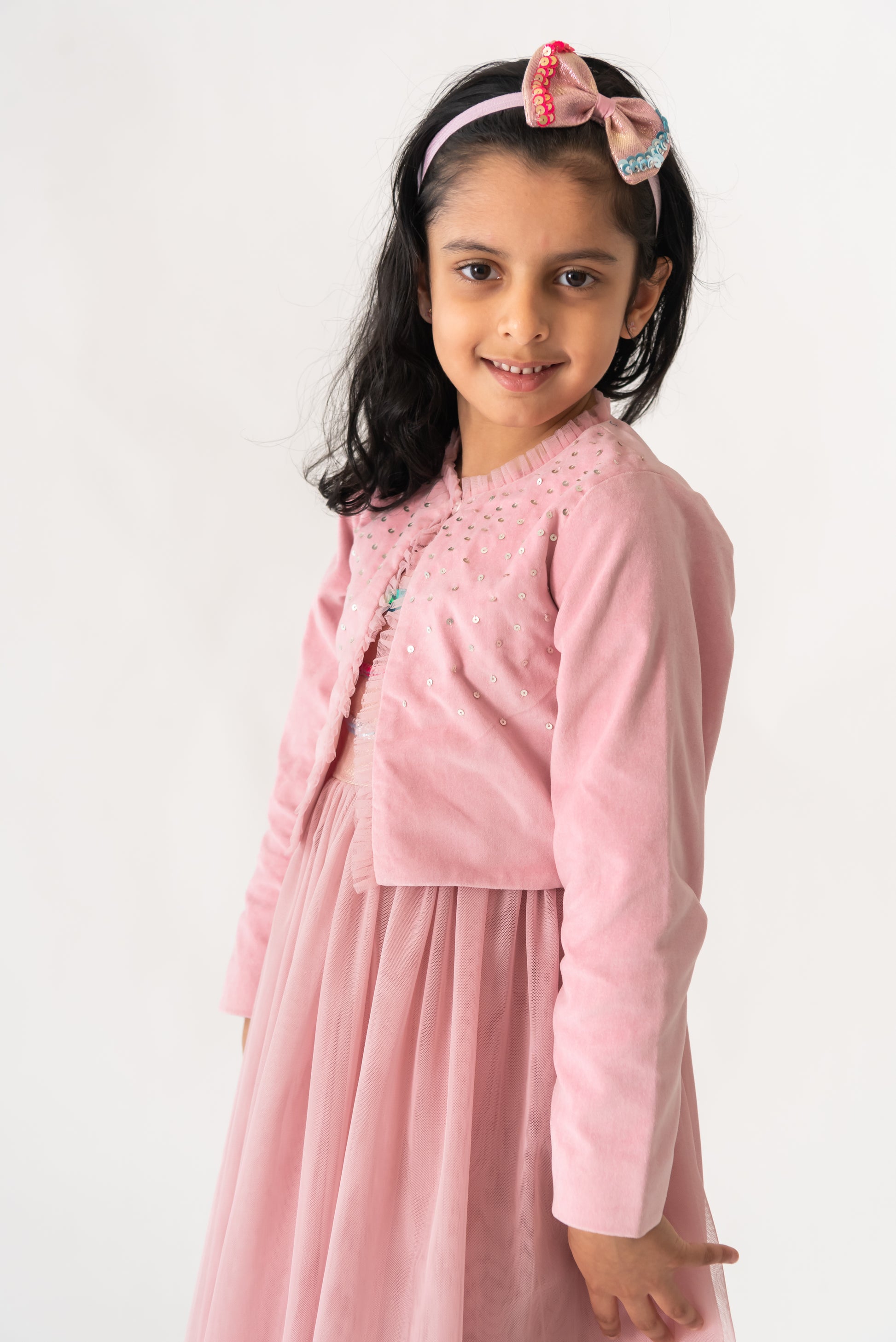 A comfortable velvet shrug with tulle ruffles, for your little one. A shrug so gorgeous and delicately designed that it will certainly make your little one stand out at the party. A perfect top layer in soft cotton velvet, with all over sequins and fastens with a single button. Layer it over her favourite dress.