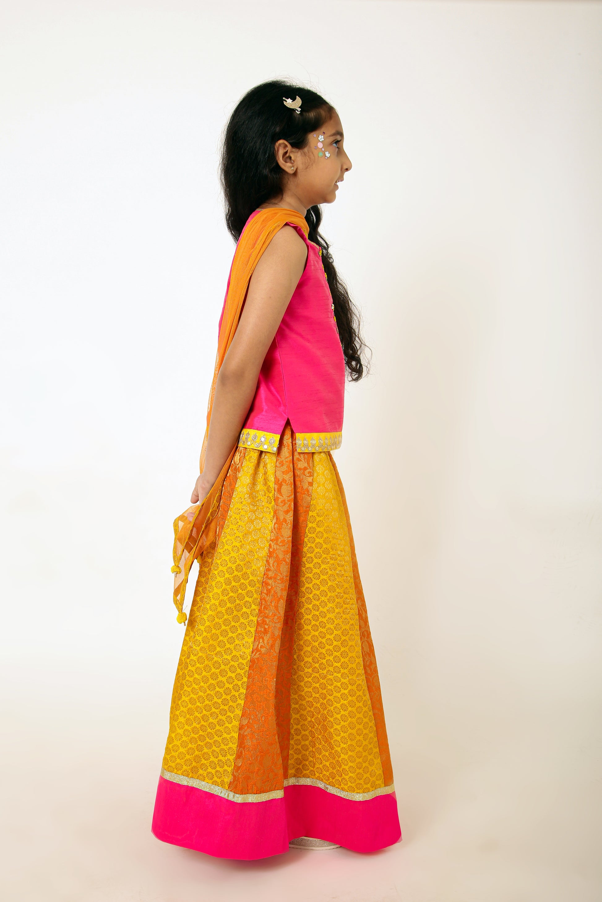A classic pick for your royal princess who'll stand out on any special occasion in this Pink and orange lehnga choli set. Made in Benaras jacquard / zari fabric with hand embroidered sequins and gota work, this is a beautiful brocade lehnga with a gota border and a tulle dupatta matching with the lehnga.