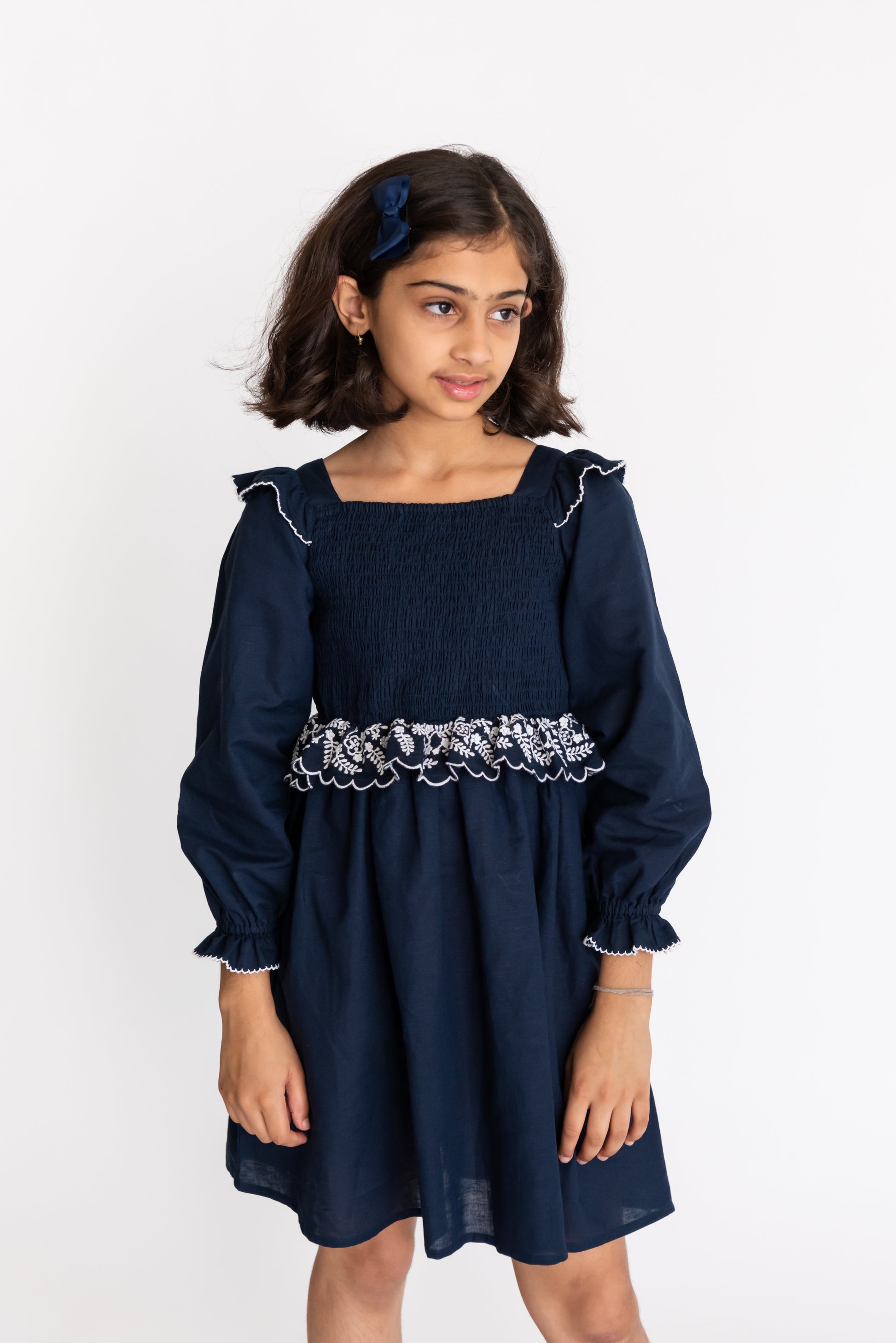 Our Voila smocked is an adorable smocked dress with white coloured embroidery. The dress features a fitted bodice with a gathered skirt and long sleeve detail. Perfect for any occasion. The waist band ruffle is adorned with elegant embroidery and sleeves and shoulder has contrasting picotting detailing to make this dress a perfect evening wear.