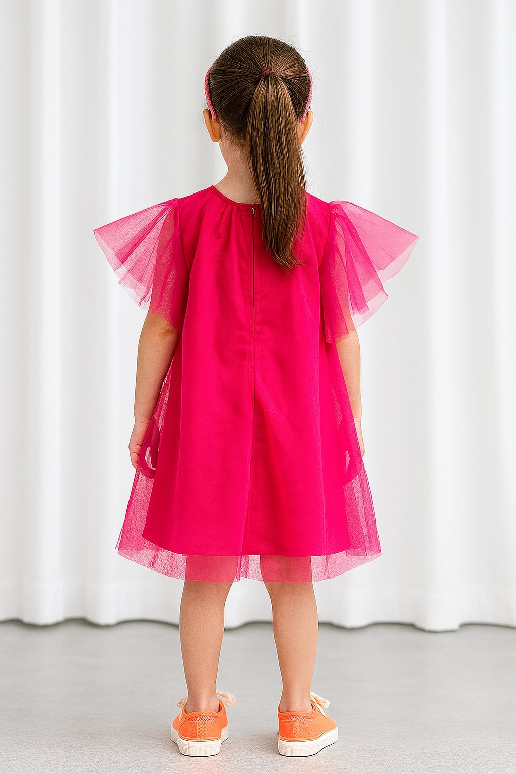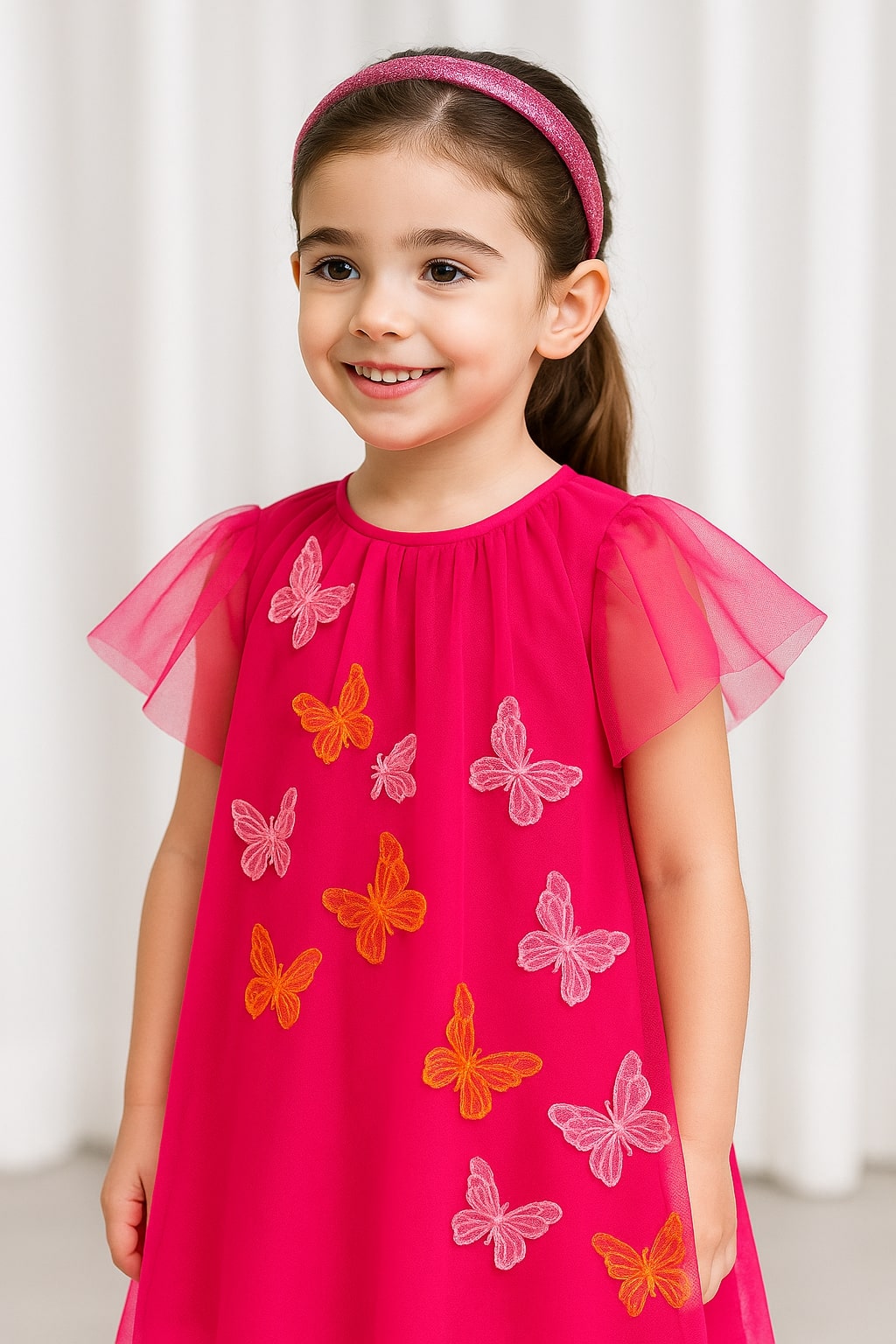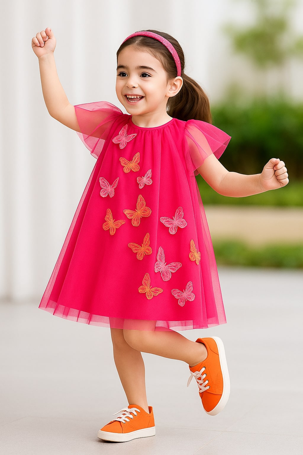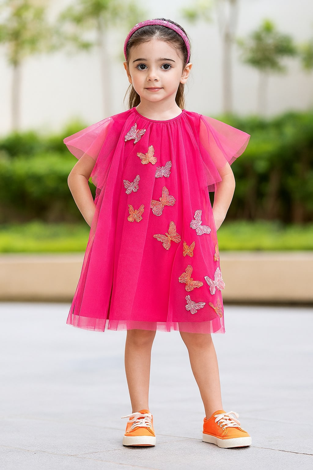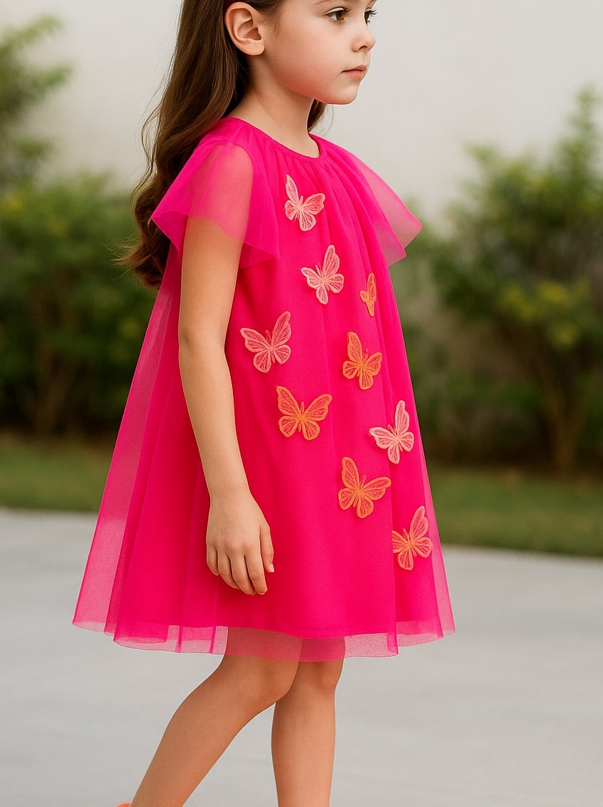 This enchanting dress is crafted in layers of soft tulle, creating a dreamy, flouncy silhouette. Delicate butterflies—each intricately embroidered and hand-attached—flutter gracefully across the surface, adding an ethereal charm.